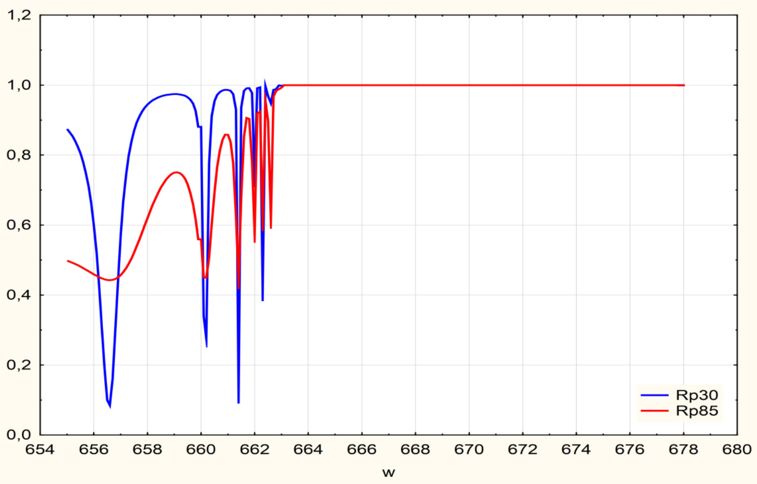 Рис. 1. Зависимость энергетического коэффициента отражения p-поляризации от частоты при значениях угла падения 30 ° и 85 °