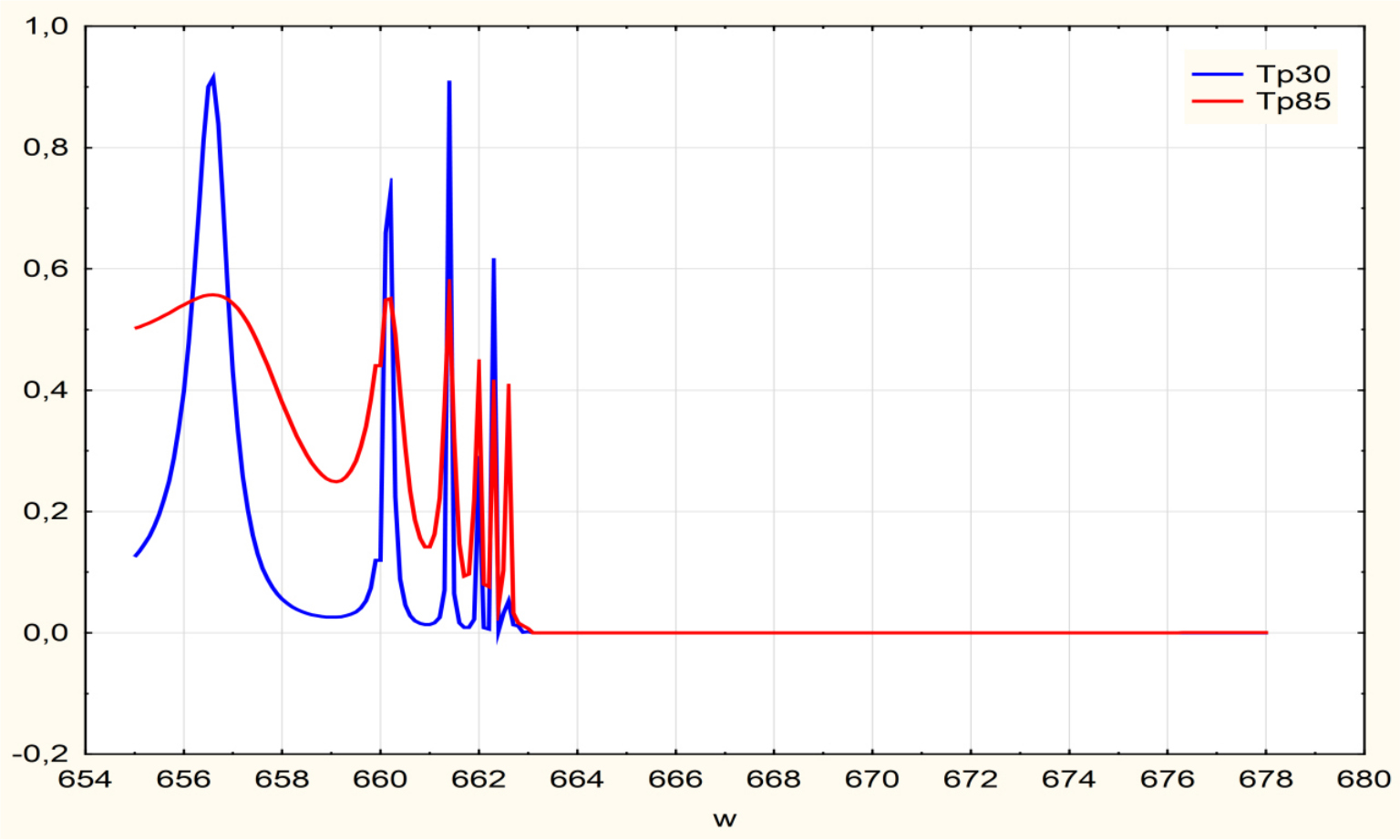 Fig. 2. Dependence of the energy coefficient of p-polarization on frequency at the following values of the angle of incidence 30 ° and 85 °