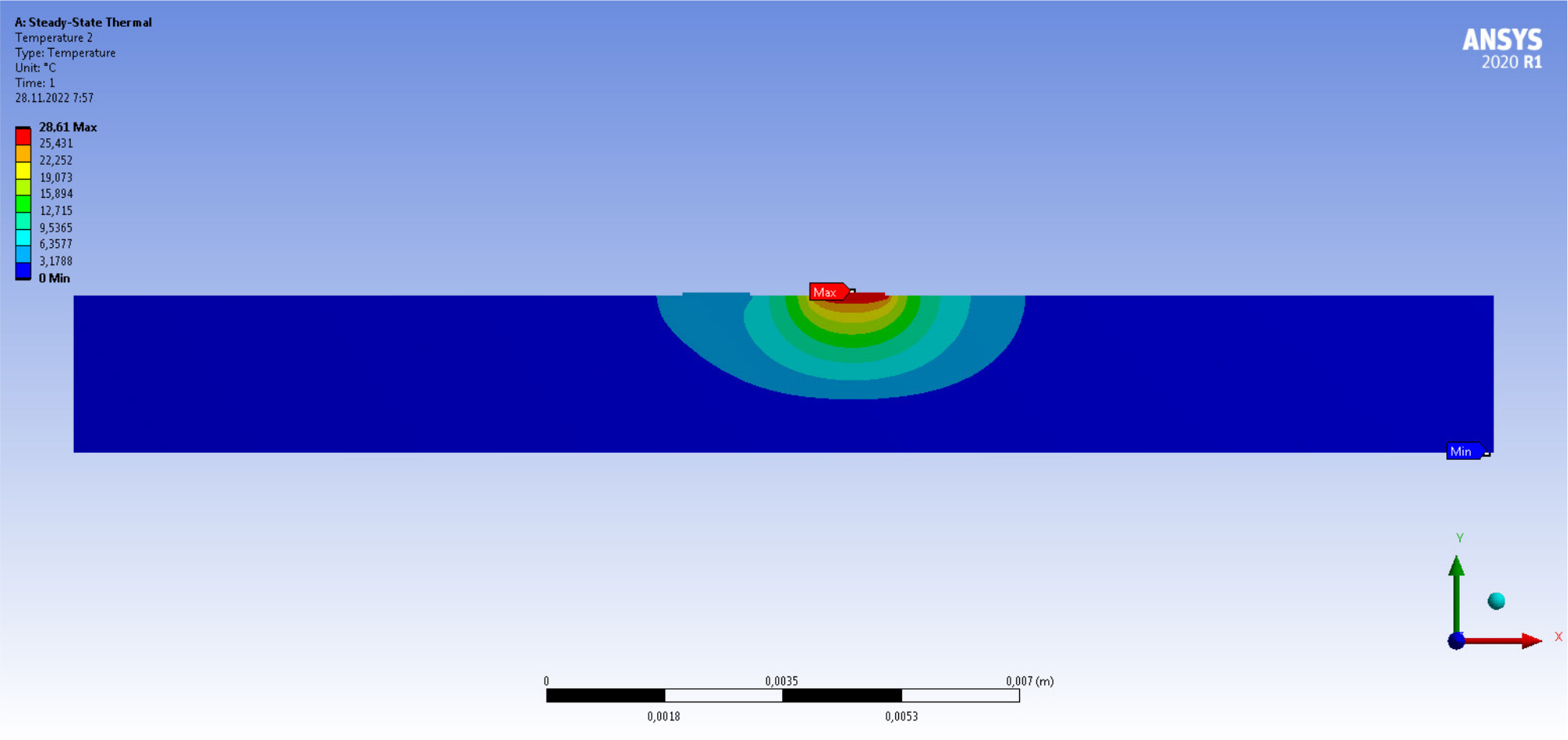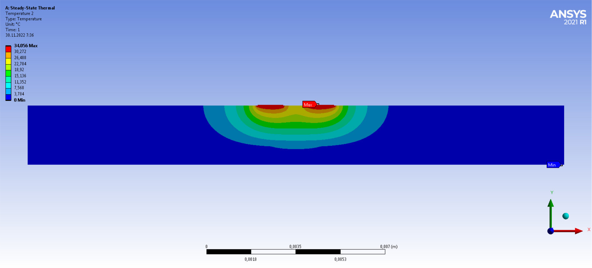 Рис. 2. Температурное поле, создаваемое ПП расположенным справа, ПП слева неактивен, t1 = 1 мм