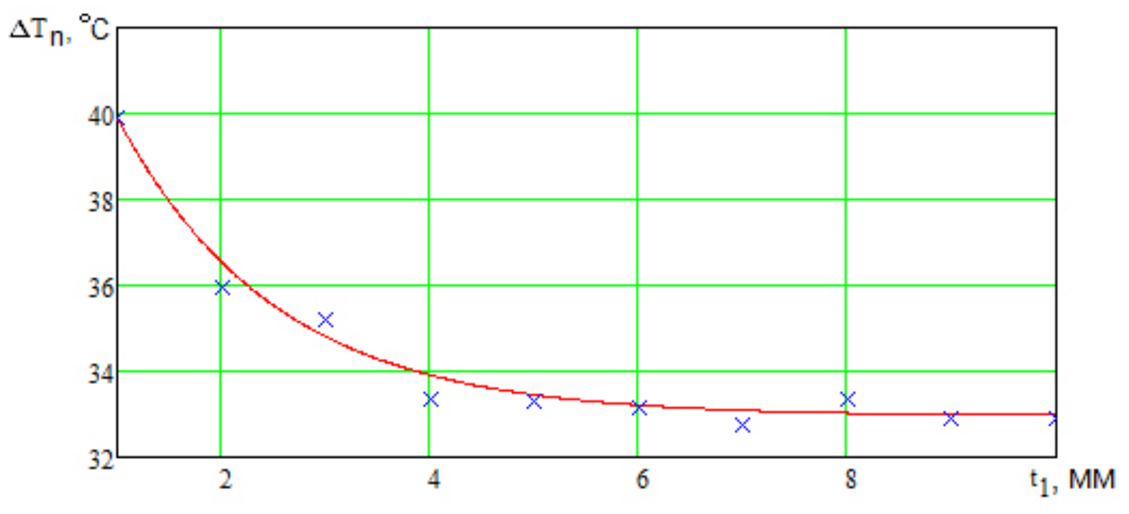 Fig. 5. The dependence of the overheating of the printed circuit board conductors of type 4 on t1