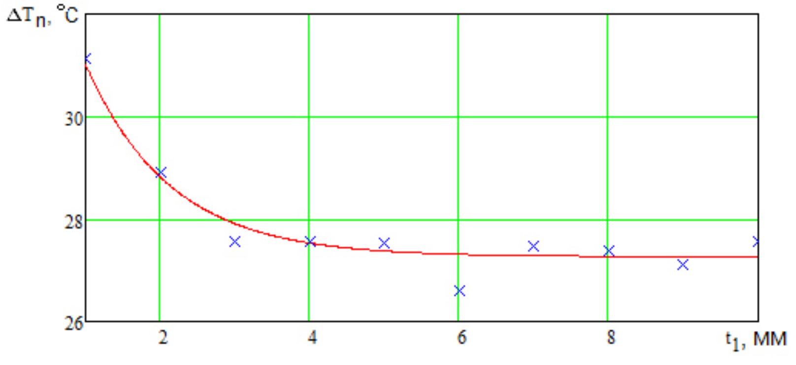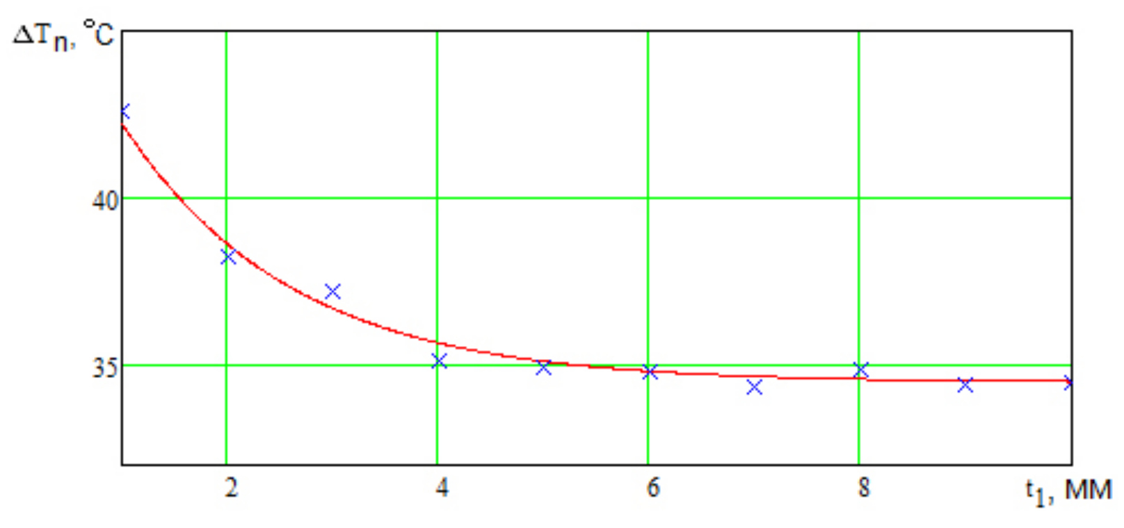 На рис. 5–7 приведены точки, соответствующие значениям перегревов, приведенным в табл. 2 и графики зависимостей перегрева от расстояния между ПП. Графики получены путем аппроксимации методом наименьших квадратов. Если рассматривать данные, приведенные в табл. 2, то видно, что перегревы первого и второго ПП практически не отличаются. Это вполне логично, ведь они одинаковые. Для построения и аппроксимации взяты значения перегревов для левого ПП.