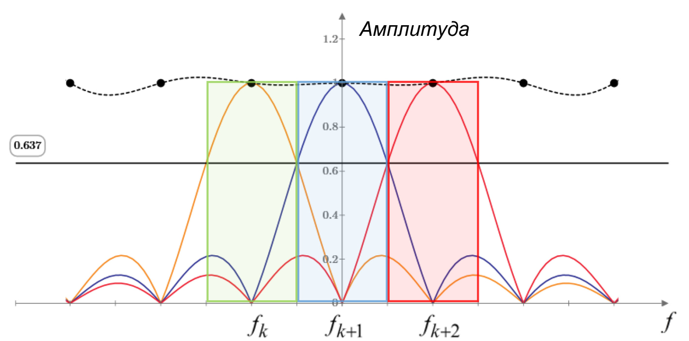 Пересечение графиков синуса Котельникова происходит на уровне При этом полоса частот элемента многочастотного сигнала длительностью равна Таким образом многочастотный импульс с ортогональными поднесущими можно рассматривать как альтернативу одночастотному импульсу с последовательной перестройкой с шагом Задача синтеза многочастотного сигнала может быть решена путем применения обратного дискретного преобразования Фурье (ОДПФ) к дискретным комплексным отсчетам, задающим начальную амплитуду и фазу соответствующей поднесущей.