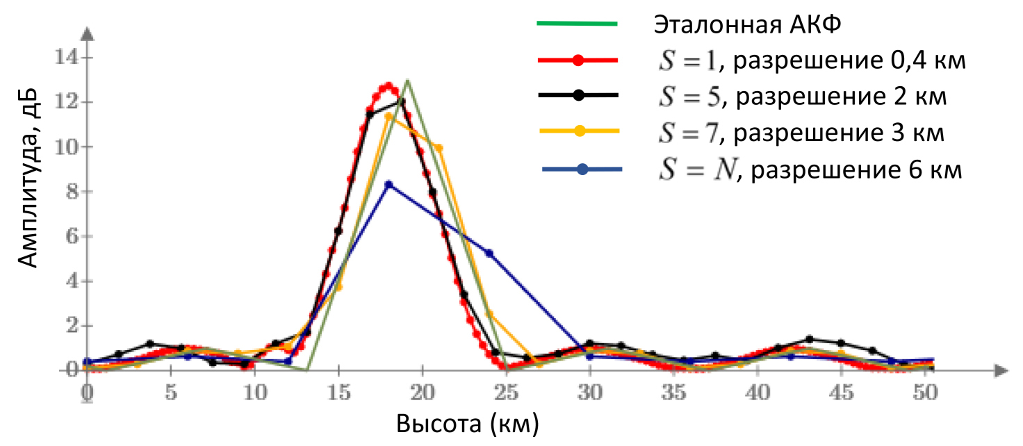 Для реализации предложенного подхода в эксперименте использован многопарциальный импульс, представляющий собой сумму восьми ортогональных парциалов с двоичной фазовой манипуляцией каждого частотного парциала кодовой последовательностью Баркер-13. Полоса каждого частотного парциала составляла 24,4 кГц, длительность парциала – 520 мкс, а его период повторения ~ 5,1 мс.