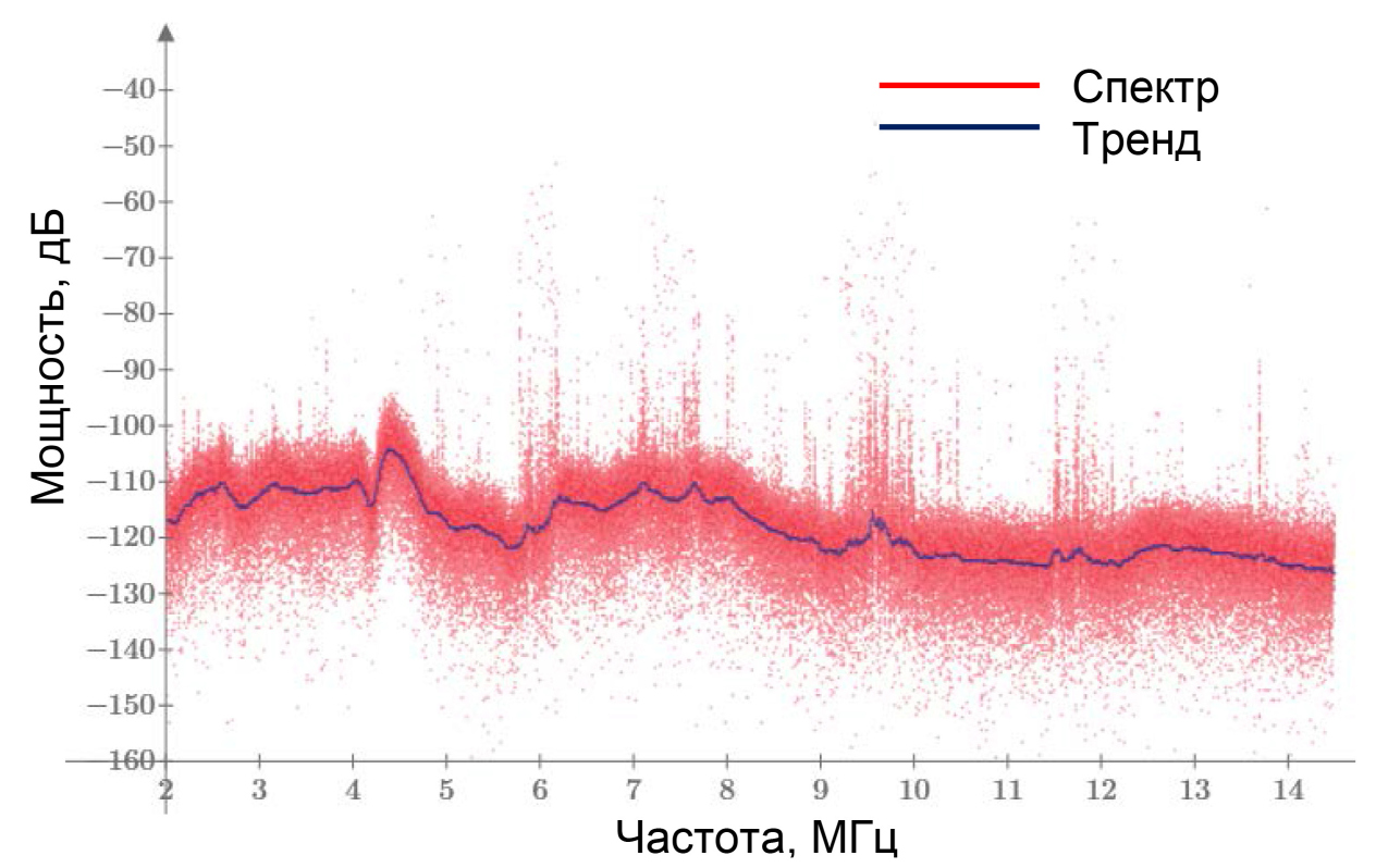 Рис. 4. Спектр смеси шума и антропогенных помех и его тренд