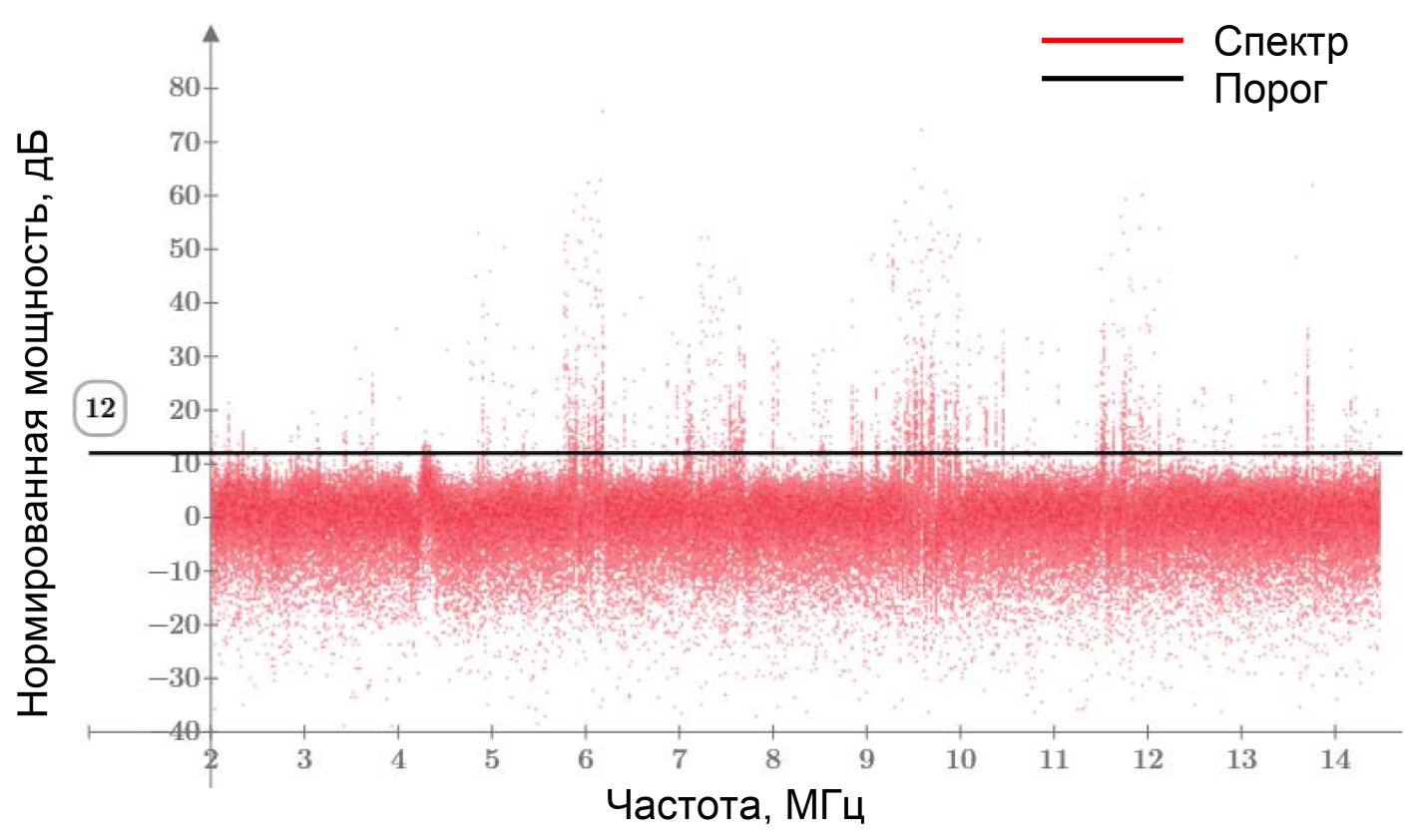 Спектральный мониторинг квазивертикальных ионосферных каналов основан на пороговом обнаружении сосредоточенных помех в упорядоченном многомерном широкополосном радиоканале. Большинство помех в КВ-диапазоне имеет полосу 3 кГц (SSB-станции). Широкие полосы около 20 кГц соответствуют вещательным DRM-стан циям, но больше всего помех дают вещательные станции с АМ-модуляцией, создающие помеху в полосе 9–10 кГц. Стандартами связи [6] предусмотрены максимальные полосы каналов до 24 кГц. Исходными данными спектрального мониторинга является рассчитываемый с использованием FFT спектр мощности с разрешением 100 Гц. Количество отсчетов в спектре 125 000. Полоса составляет 12,5 МГц (от 2 до 14,5 МГц). Спектральные комплексные отсчеты усредняются по 100 последовательным спектрам и пересчитываются в отсчеты мощности так, что в результате получается усредненный за 1 с спектр мощности шума и помех. Пример спектра, полученный в г. Йошкар-Оле (ПГТУ) с использованием универсальной аппаратной платформы типа USRP N210, показан на рис. 4. В качестве антенны использовался широкополосный (рабочий диапазон 1,9…30 МГц) диполь типа AH-710, установленный на крыше пятиэтажного здания.