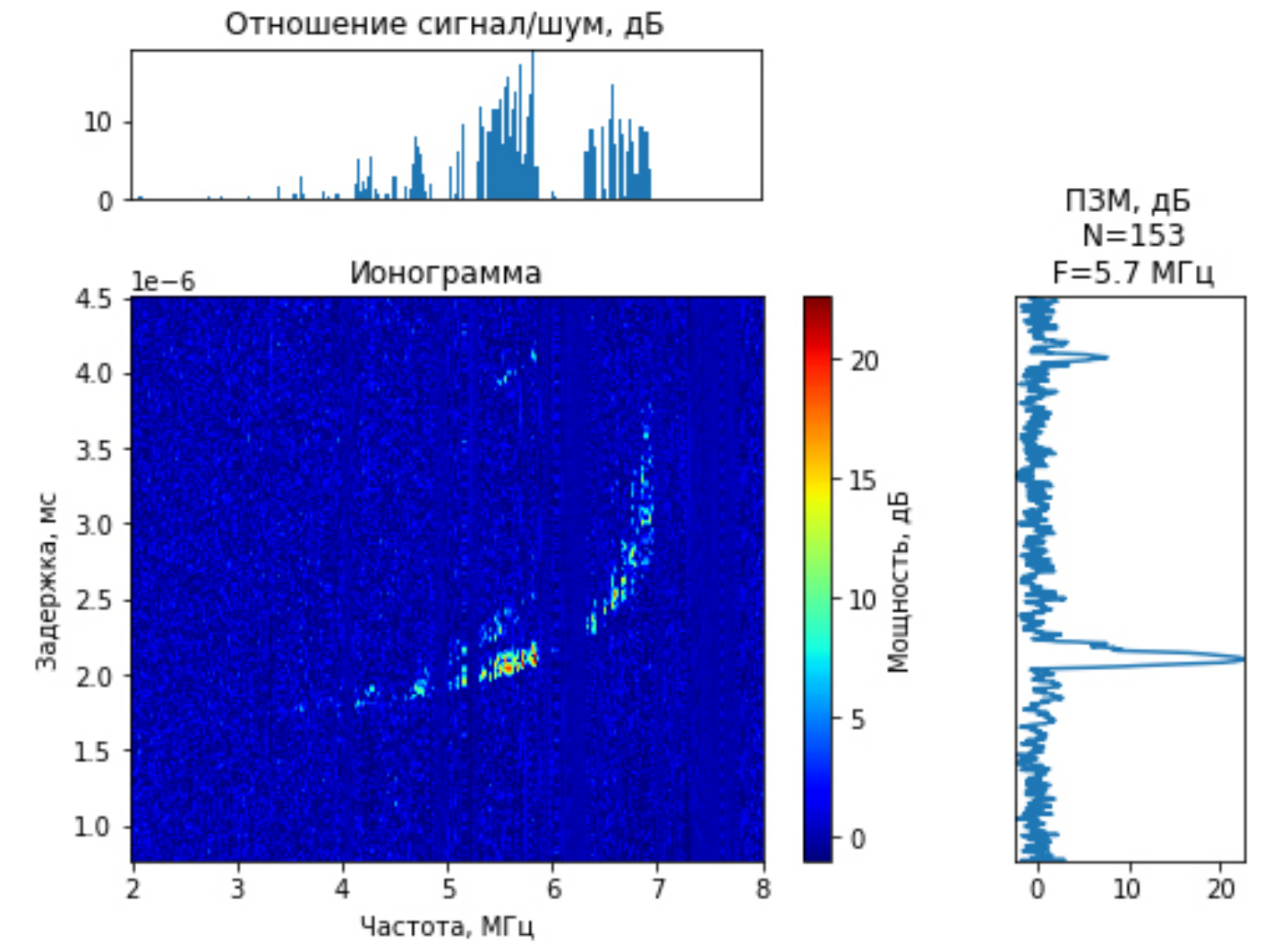 Алгоритмы были реализованы на универсальной SDR-платформе USRP N210. В результате NVIS-эксперимента, проведенного 13.03.2023 в 20:49 в г. Йошкар-Ола (ПГТУ), получена информация о состоянии радиоканалов в диапазоне 2–8 МГц (рис. 7). На верхнем графике отражена частотная зависимость отношения сигнал/шум, по которой можно определить, что наилучшим каналом с максимальным отношением сигнал/шум является канал номер 153 с частотой 5,7 МГц. Это же подтверждает пассивная диагностика СПМ. Профиль задержки мощности (ПЗМ) для этого канала показан на рисунке слева. Вертикальная ось соответствует задержке при распространении от передатчика к приемнику. На горизонтальной оси отложена мощность ПЗМ и помех в канале на частоте 5,7 МГц. Видно, что временная дисперсия в данном канале (рассеяние по задержке) не превышает 0,3 мс. Провалы до нуля на графике отношения сигнал/шум соответствуют бланкированным парциальным каналам из-за их значительной загруженности. Как видно на этом примере, из 245 частотных каналов для связи доступны только около двадцати.
