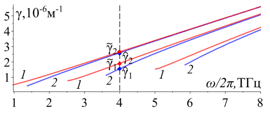 Вертикальная прямая на рис. 1, 2 отвечает соответственно ТЕ- и ТМ-поляризованным волнам с частотой 4 ТГц. Вертикальная прямая мкм на рис. 3, 4 соответствует волноводу толщиной 20 мкм. Точки пересечения дисперсионных кривых с этими прямыми, обозначенные на рисунках ромбами, являются постоянными распространения волновода.