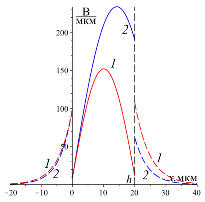 В вычислениях мы использовали следующие значения для диэлектрических проницаемостей: , Проницаемостью обладает кремний а проницаемостью обладает диоксид кремния [22; 23].