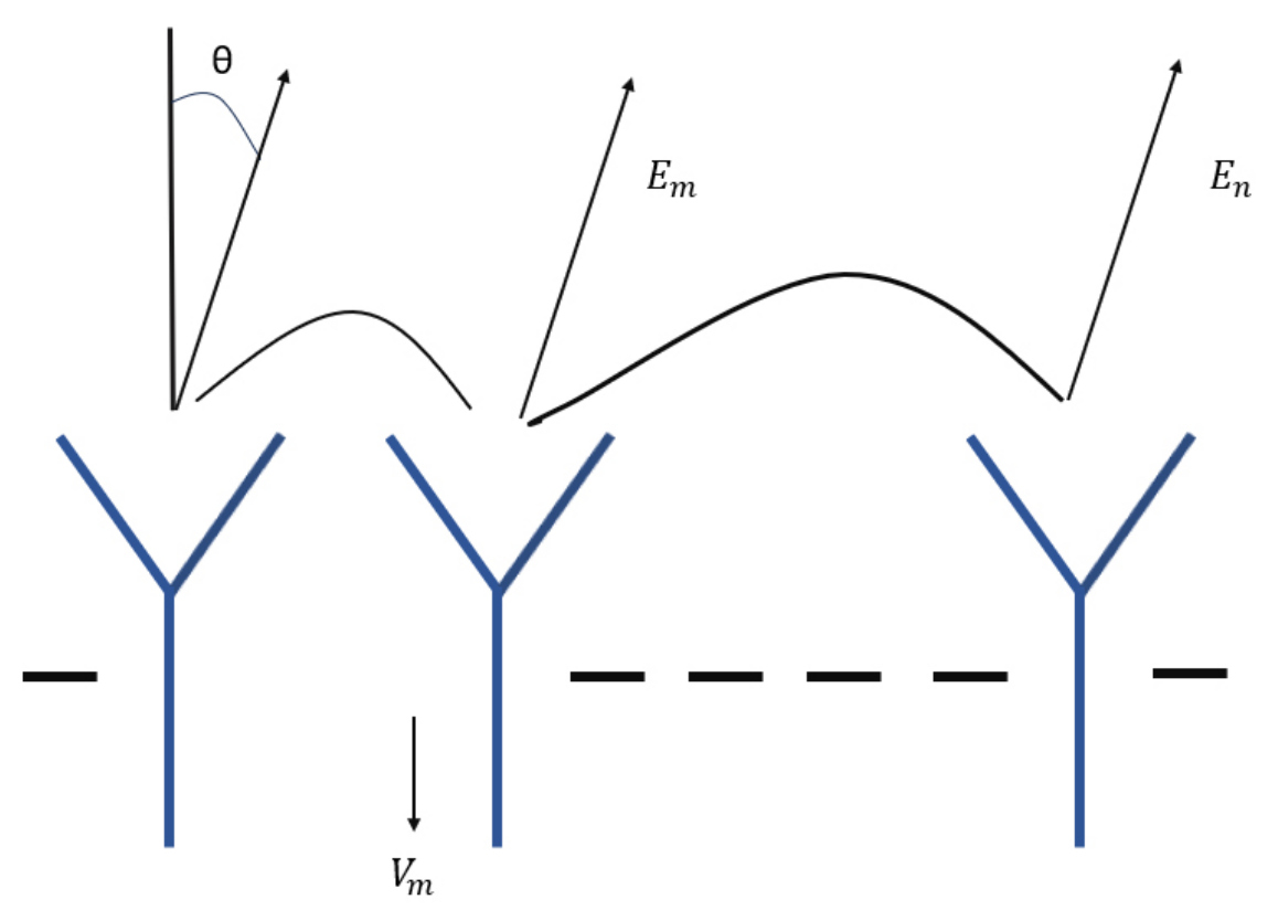 Рассмотрим применение этого подхода на примере антенной решетки, изображенной на рис. 1. Взаимодействие можно представить как бесконечную последовательность процессов излучения, поглощения и дальнейшего переизлучения мощности антенными элементами рассматриваемой решетки.