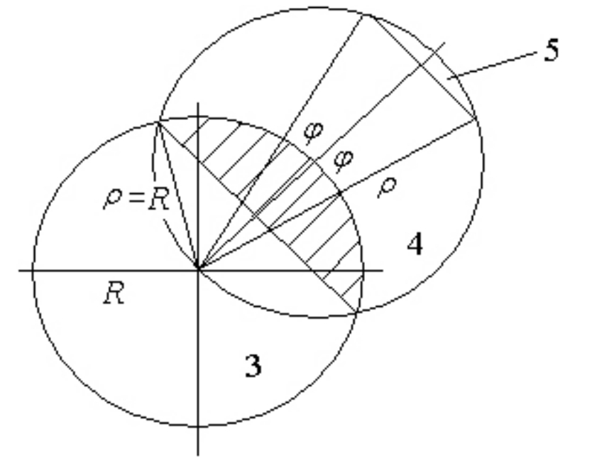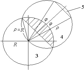 Let us consider regions 3 and 4 in the radio signal cross section. These areas slightly differ in intensity, i.e., experience intensity fluctuation. We assume that both regions are circular with a radius of R. We assume that region 4 partially overlaps region 3 such that the circumference of region 4 passes through the center of region 3. Although the exact implementation of this model in practice is improbable, it enables the calculation of the radial correlation of radio signal intensities. In this model, the intensity correlation occurs over twice the area of the shaded segment (Fig. 2). The area of arbitrary segment 5 can be determined by subtracting the area of an equilateral triangle with a vertex angle 2φ from the area of the sector with the angle 2φ: