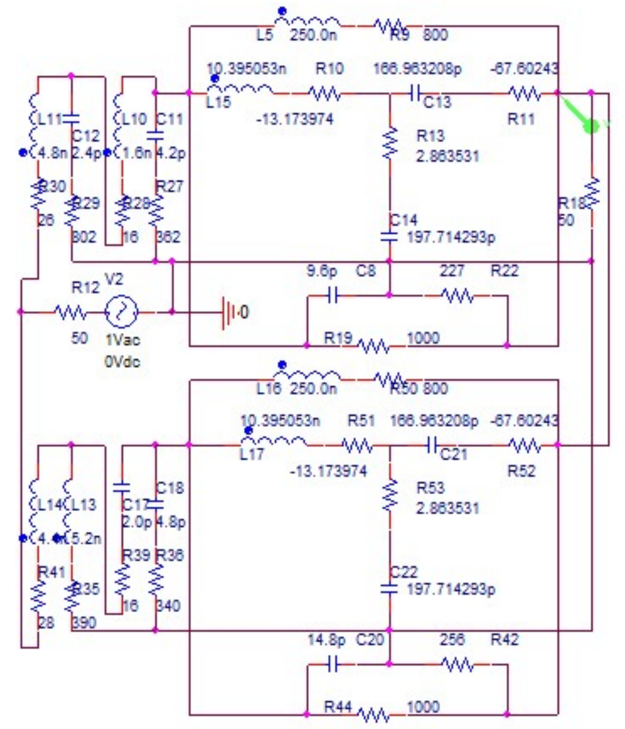 Средняя частота эквивалентной схемы (рис. 11) МГц (рис. 12, б и в) совпадает со средней частоты принципиальной схемы (рис. 12, а). Значения модулей передаточной функции принципиальной (рис. 10) и эквивалентной (рис. 11) схем усилителя равны Формы АЧХ и ФЧХ совпадают удовлетворительно. Сопротивления РЧ, ЦОС, нагрузки и источника сигнала принципиальных и эквивалентных схем усилителей полностью совпадают.