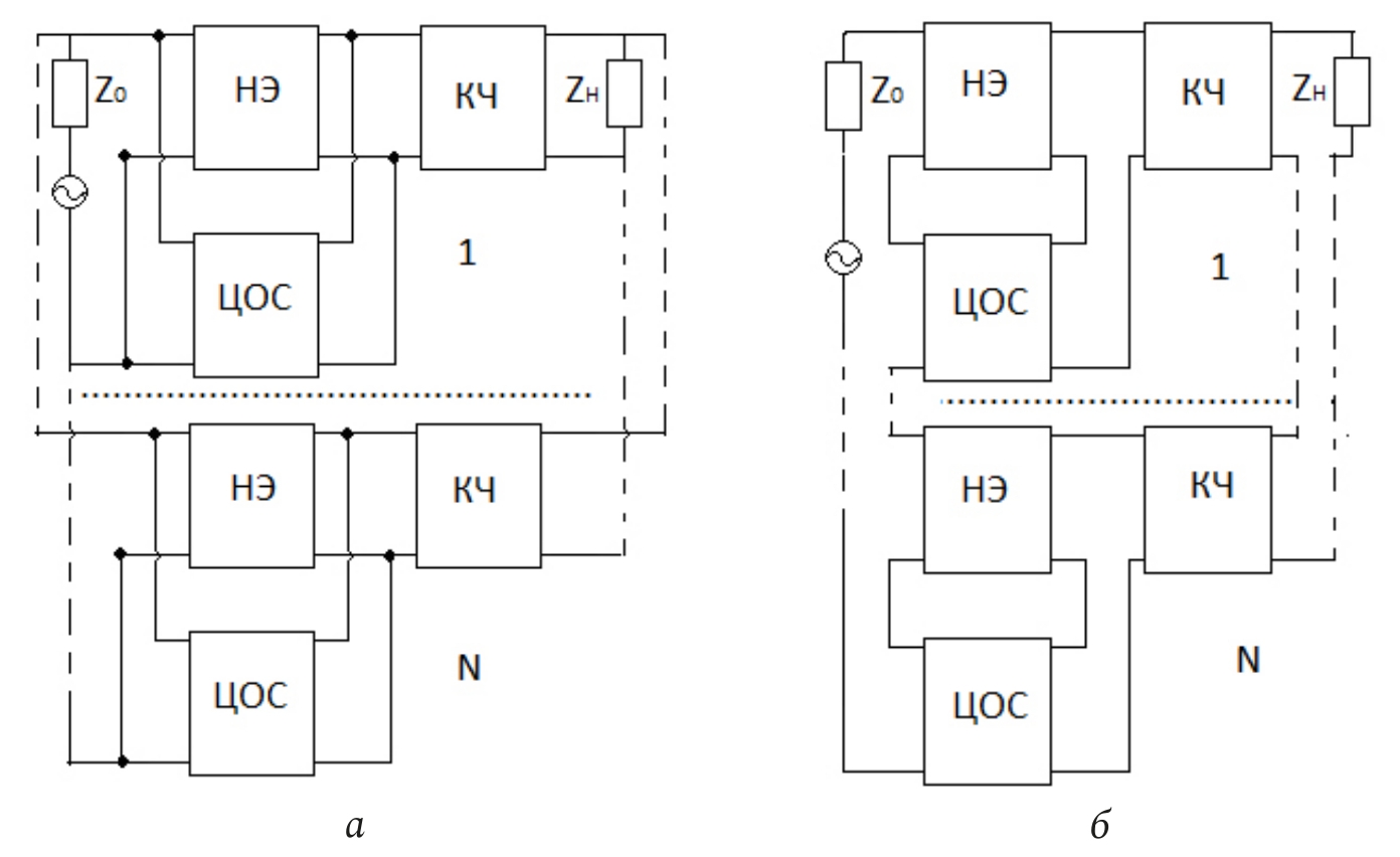 Рис. 1. Структурные схемы многокаскадных радиоустройств с параллельной по напряжению (а) и последовательной по току (б) ЦОС, включенными между источником сигнала и КЧ