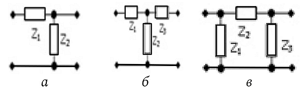 Г-образное соединение двух сопротивлений Z1,2 (рис. 3, в):