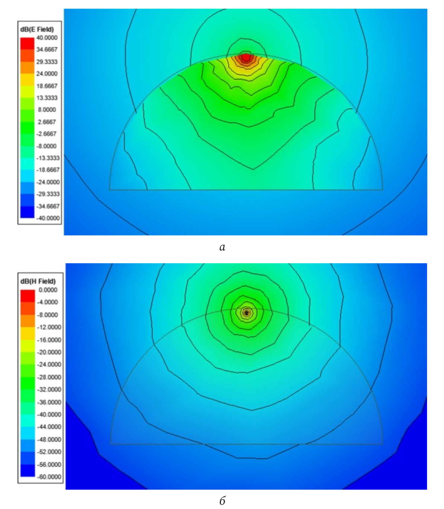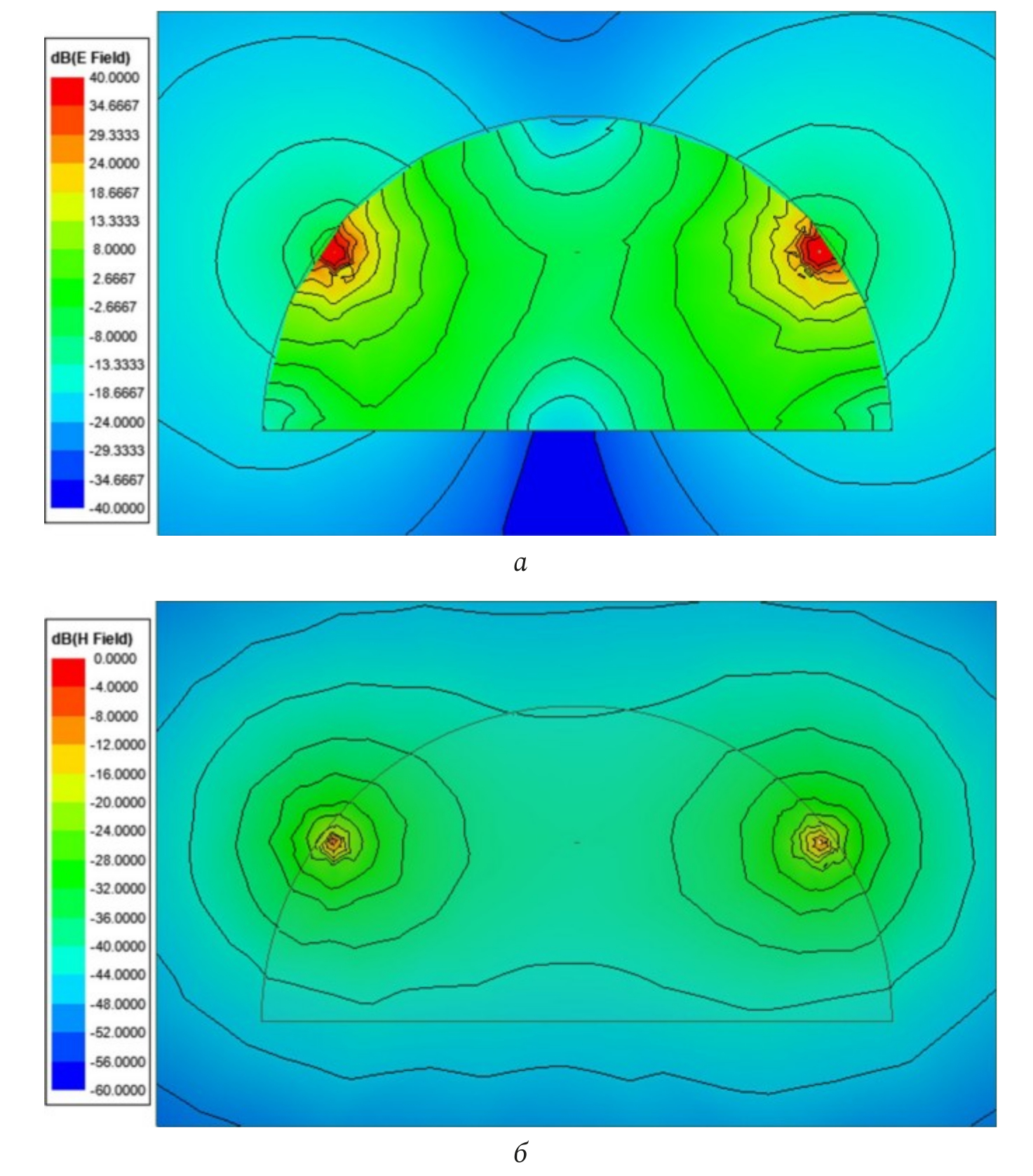 На рис. 3 приведены картины напряженности электрического (а) и магнитного (б) поля в сечении туннеля с ОНЛ, полученные моделированием методом конечных элементов (МКЭ) [7] при следующих параметрах модели:
