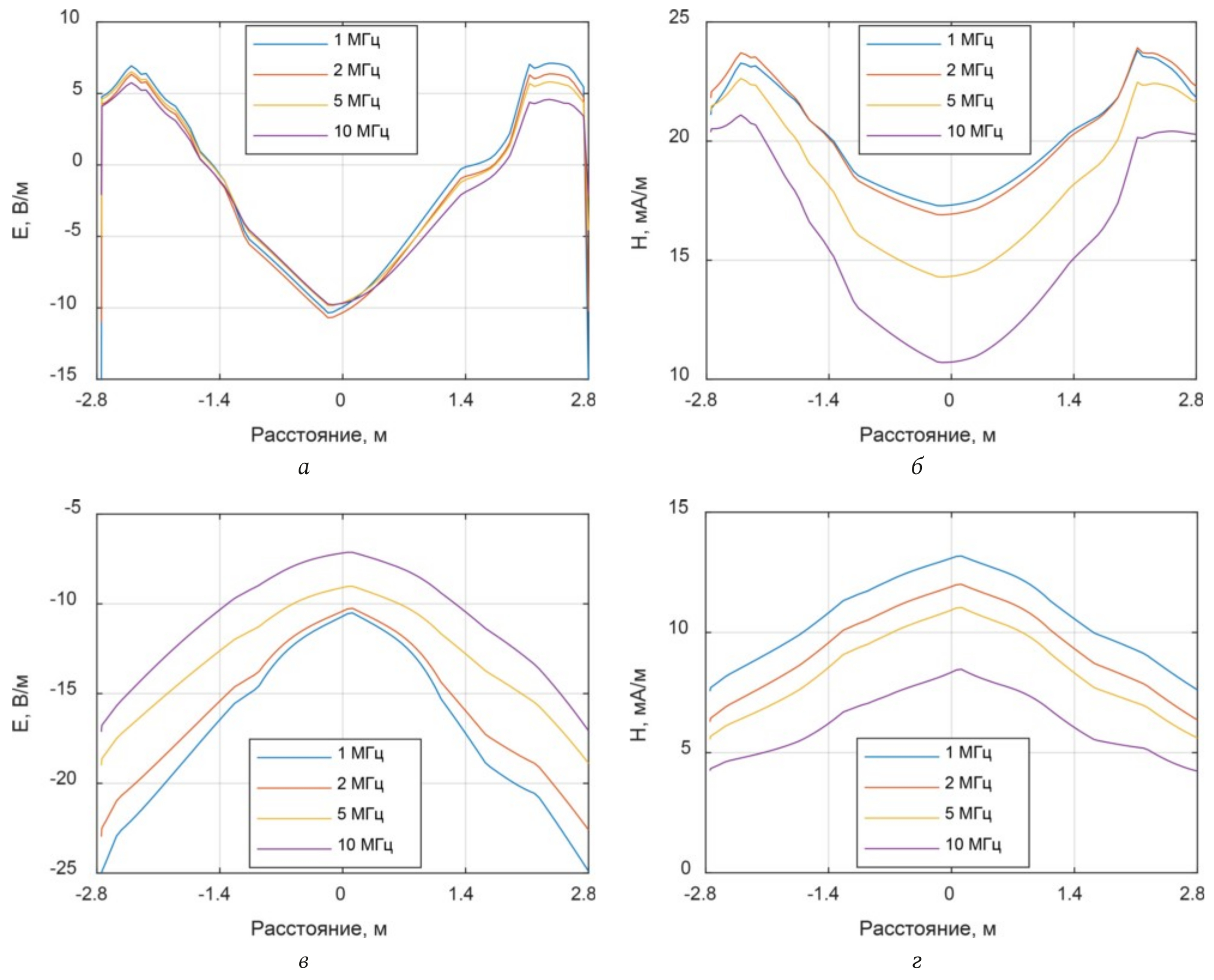 На рис. 4 приведены характерные картины напряженности электрического (а) и магнитного (б) поля в сечении туннеля с двухпроводной НЛ (ДНЛ) при тех же параметрах модели и расстоянием от проводников до породы 80 мм, а на рис. 5 – зависимости напряженности электрической и магнитной компонент поля на различных частотах для ОНЛ и ДНЛ.