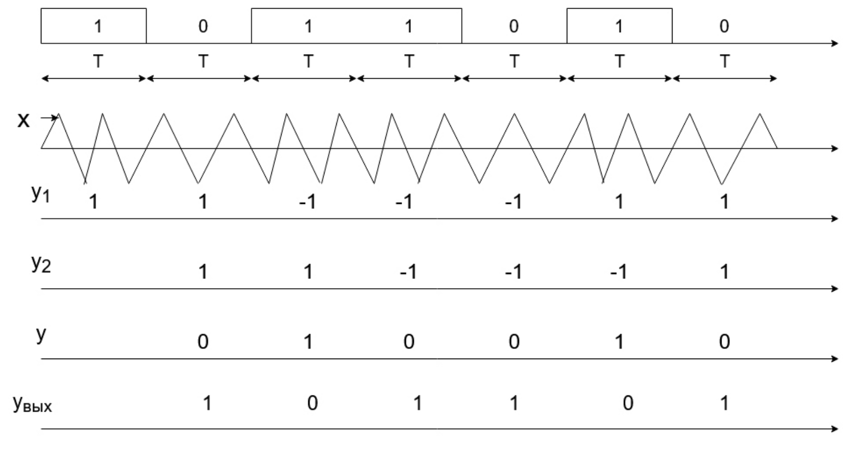 Рис. 5. Временные диаграммы, поясняющие работу демодулятора сигнала МЧМ с бинарным квантованием сигнала при Nн = 1, Nв = 2