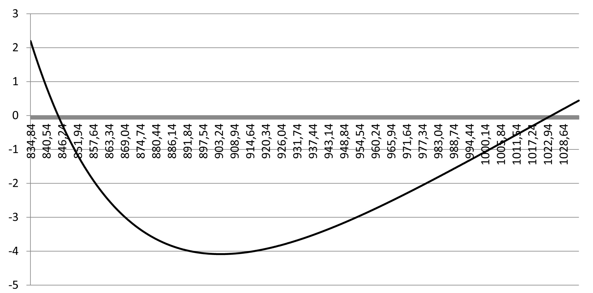 Fig. 2. Frequency dependence of the denominator in formula (14). The intersection of the curve with the x-axis gives possible values of the surface polariton frequency