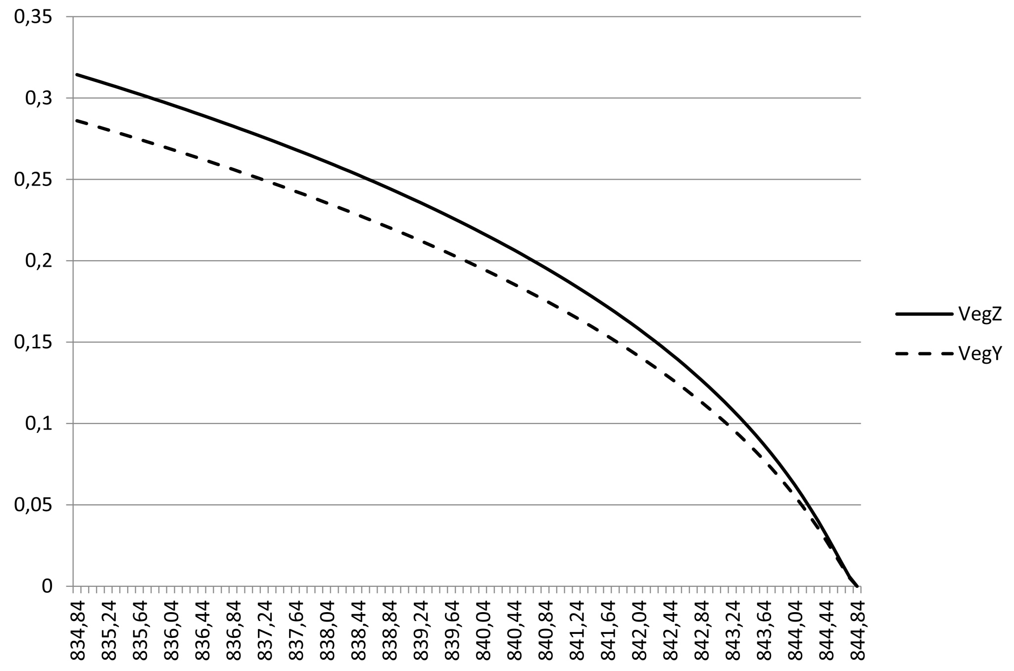 На рис. 5 показаны зависимости относительных групповых скоростей поверхностного поляритона от частоты. Здесь VegZ есть групповая скорость в случае, когда оптическая ось направлена по оси Oz, а VegY – вдоль оси Oy.