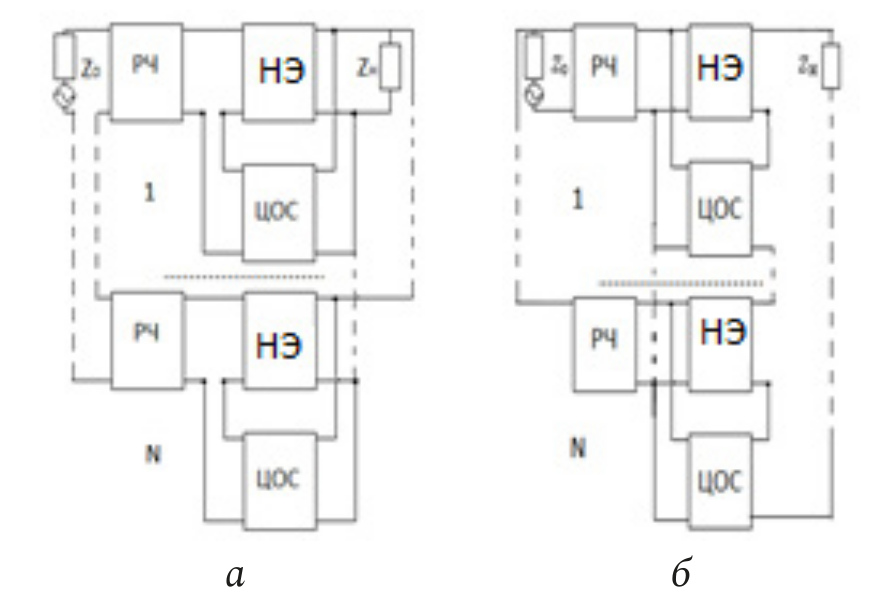 Рис. 1. Структурные схемы многокаскадных радиоустройств с параллельной по напряжению (а) и последовательной по току (б) ЦОС, включенными между РЧ и нагрузкой