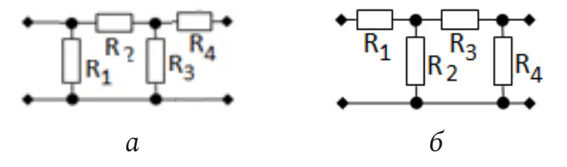 Соединение из двух обратных Г-образных звеньев в виде четырех сопротивлений (рис. 3, б):