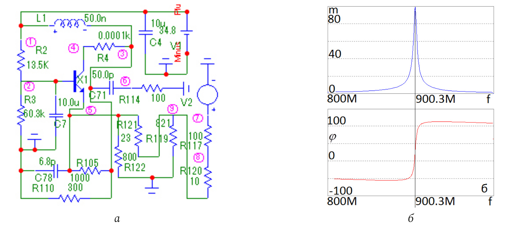 Рис. 4. Принципиальная схема однокаскадного усилителя (а), соответствующая структурной схеме (рис. 1, а), при напряжении U = 34,8 В, АЧХ и ФЧХ (б), исследуемые в системе MicroCap
