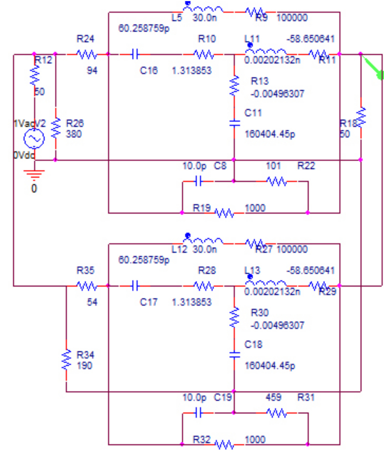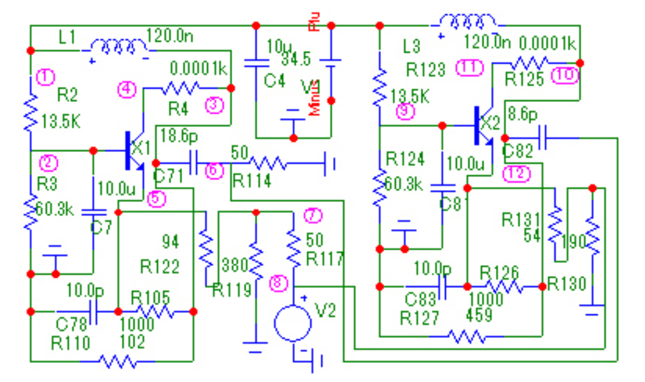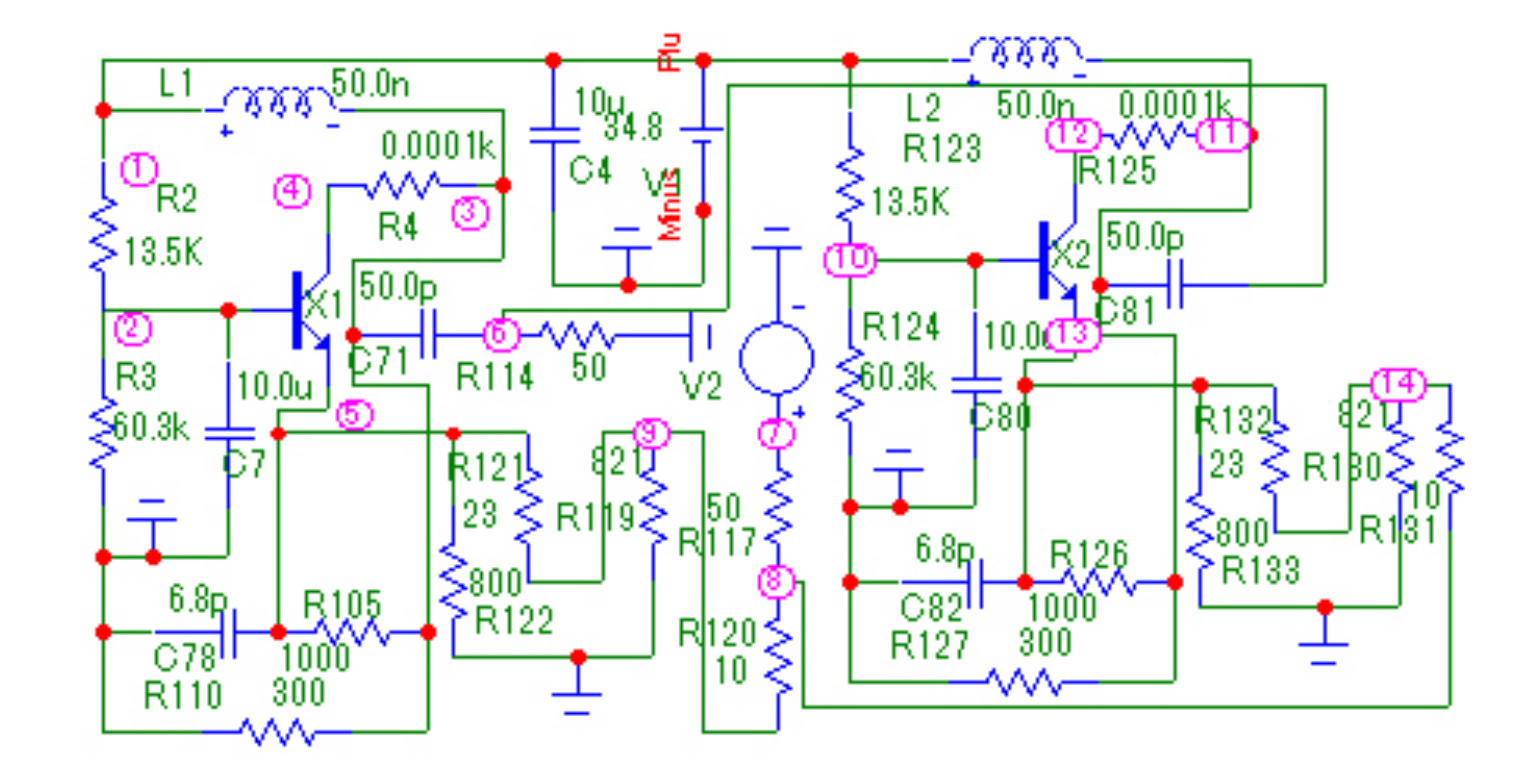 Рис. 9. Эквивалентная схема двухкаскадного усилителя (рис. 8) с неодинаковыми каскадами, соответствующая структурной схеме (рис. 1, а), исследуемая в системе OrCad