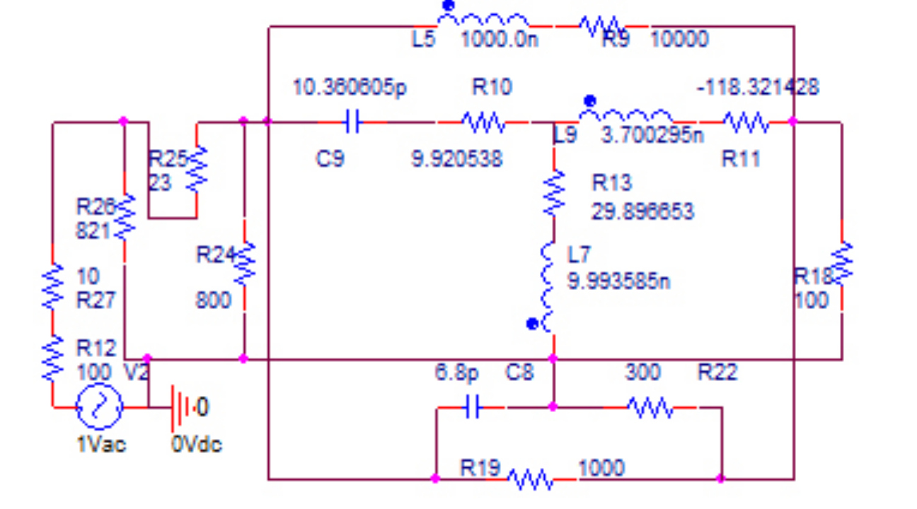 Эквивалентная схема нелинейного элемента выполнена в виде перекрытого Т-образного четырехполюсника на элементах (рис. 7). Параметры эквивалентной схемы НЭ выбраны из условия совпадения выходного сопротивления НЧ с выходным сопротивлением НЧ с использованием реального транзистора [9]. Схема НЧ реализована в виде параллельно соединенных эквивалентной схемы нелинейного элемента и цепи обратной связи из П-образного соединения трех элементов Параметры ЦОС заданы произвольно. Схема РЧ собрана на основе двух обратных Г-образных звеньев из четырех элементов