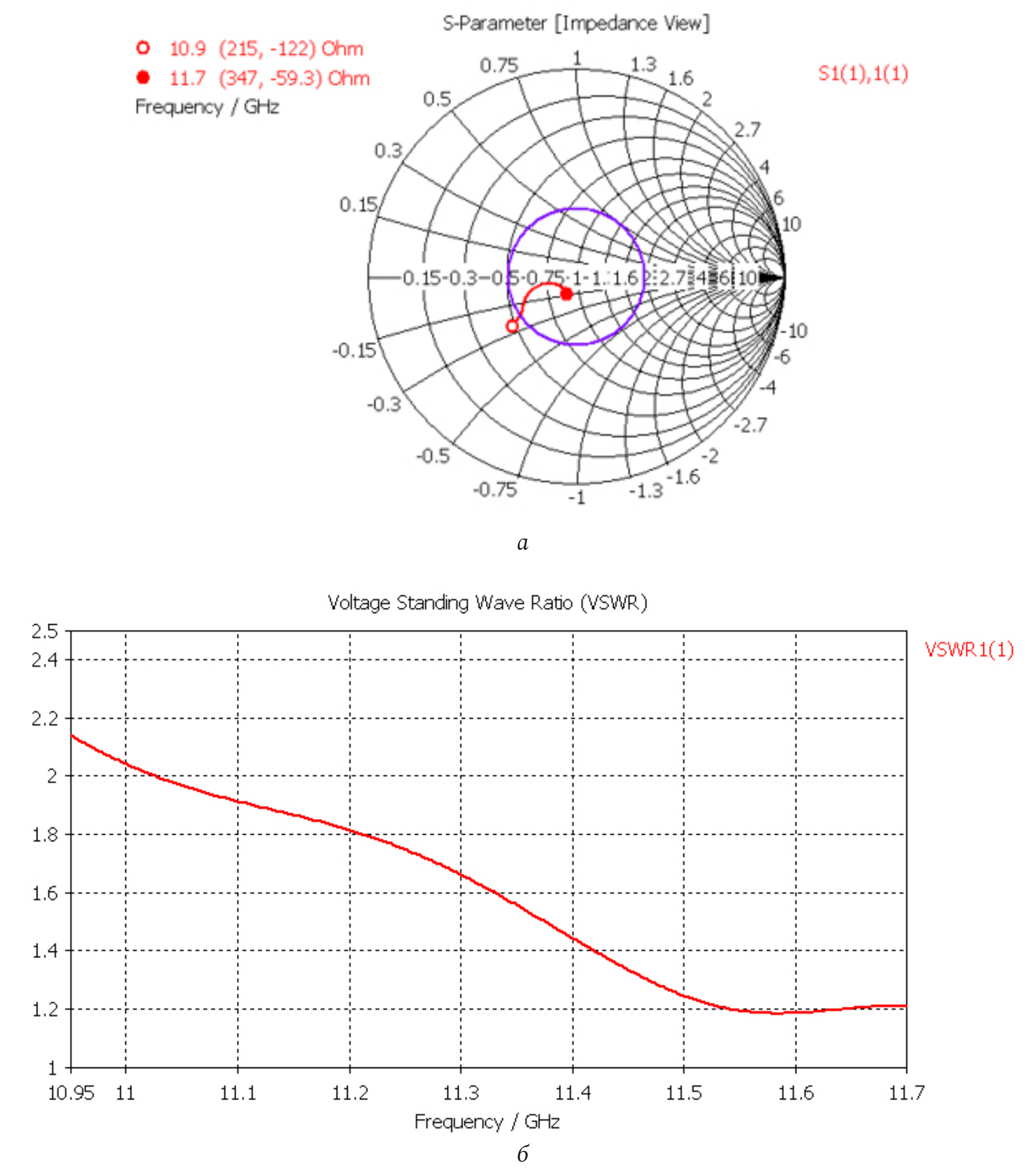 Рис. 2. Входные характеристики антенного элемента (рис. 1)