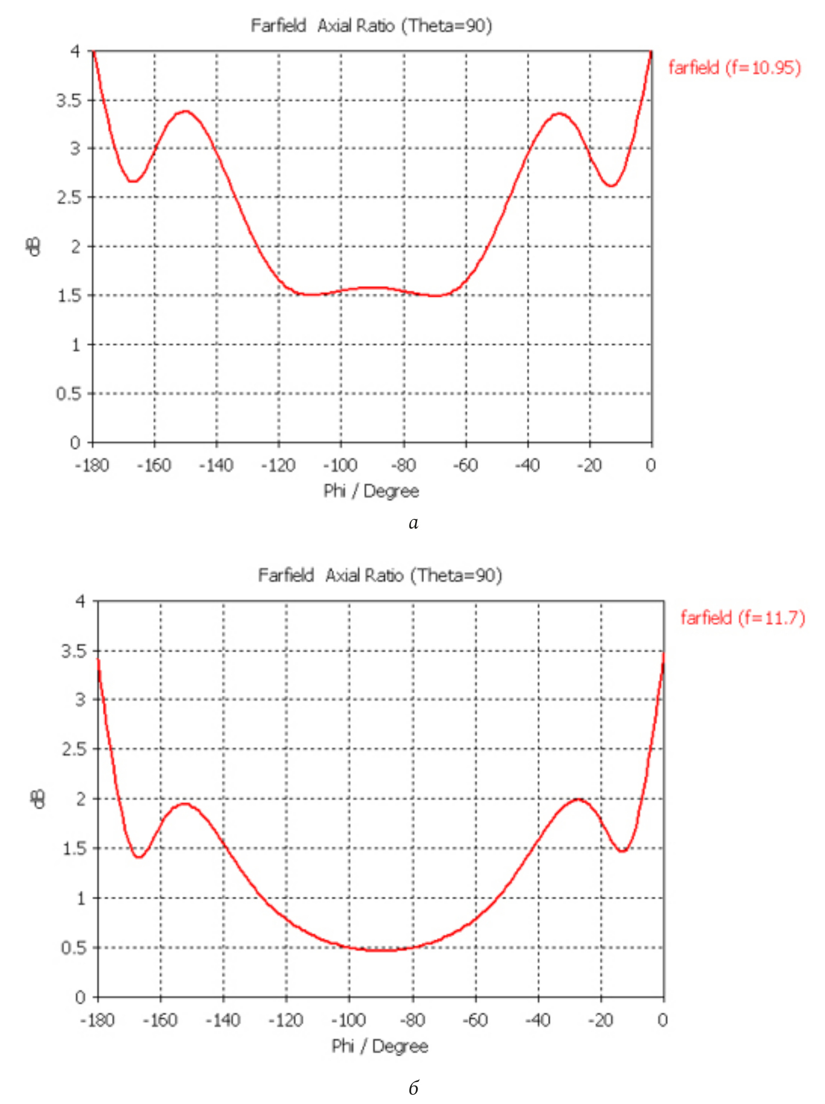 Рис. 4. Качество поляризационного эллипса, разрез в угло-местной плоскости: а – осевое отношение эллипса поляризации на частоте 10,95 ГГц; б – осевое отношение эллипса поляризации на частоте 11,7 ГГц