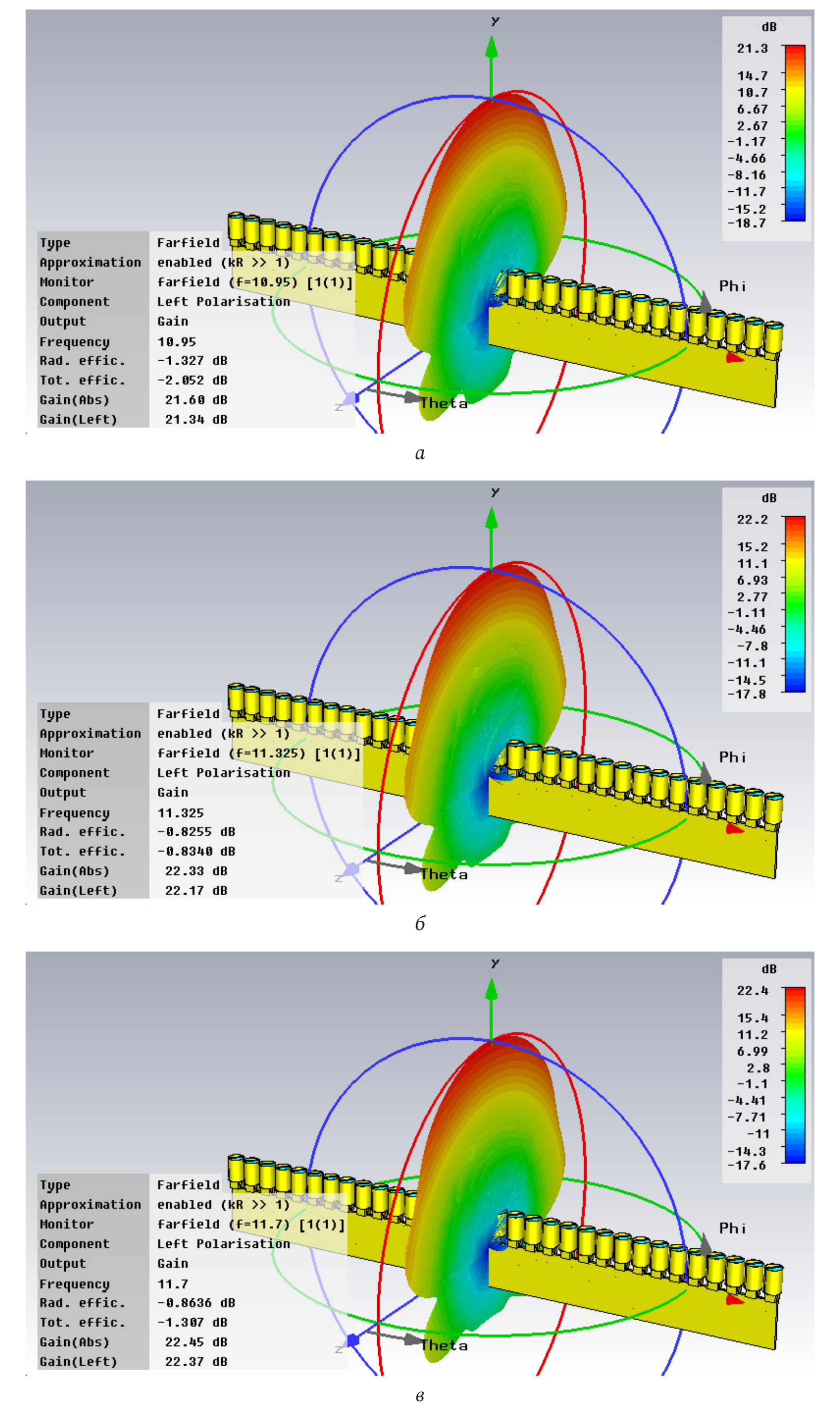 Рис. 3. ДН антенны на правой круговой поляризации: а – ДН на правой круговой поляризации на частоте 10,95 Гц; б – ДН на правой круговой поляризации на частоте 11,7 Гц