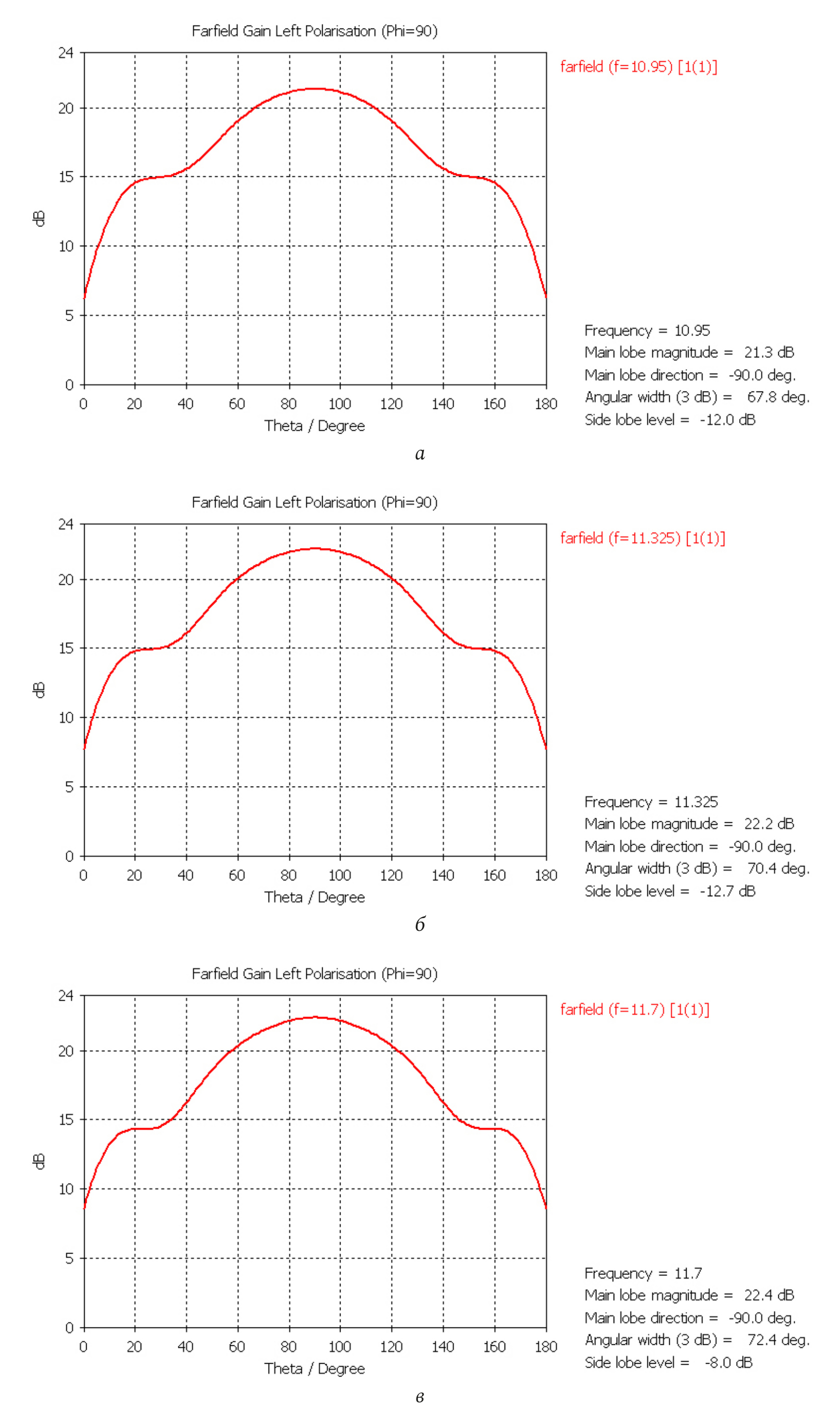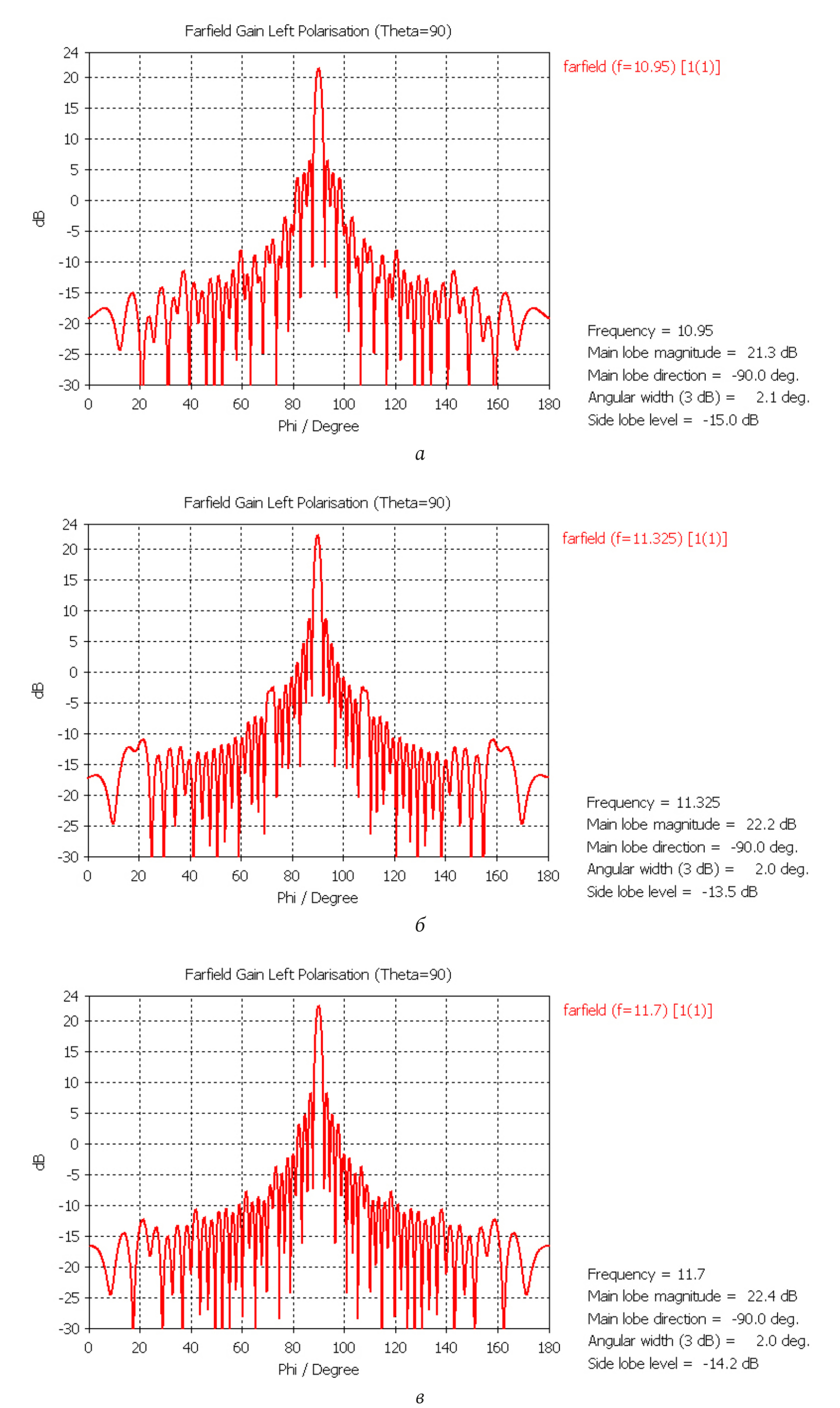 The level of the side lobes of the radiation pattern in the azimuthal plane (Fig. 6) at all frequencies is better than that of the in-phase and equal-amplitude opening of equivalent dimensions (–13,2 dB).