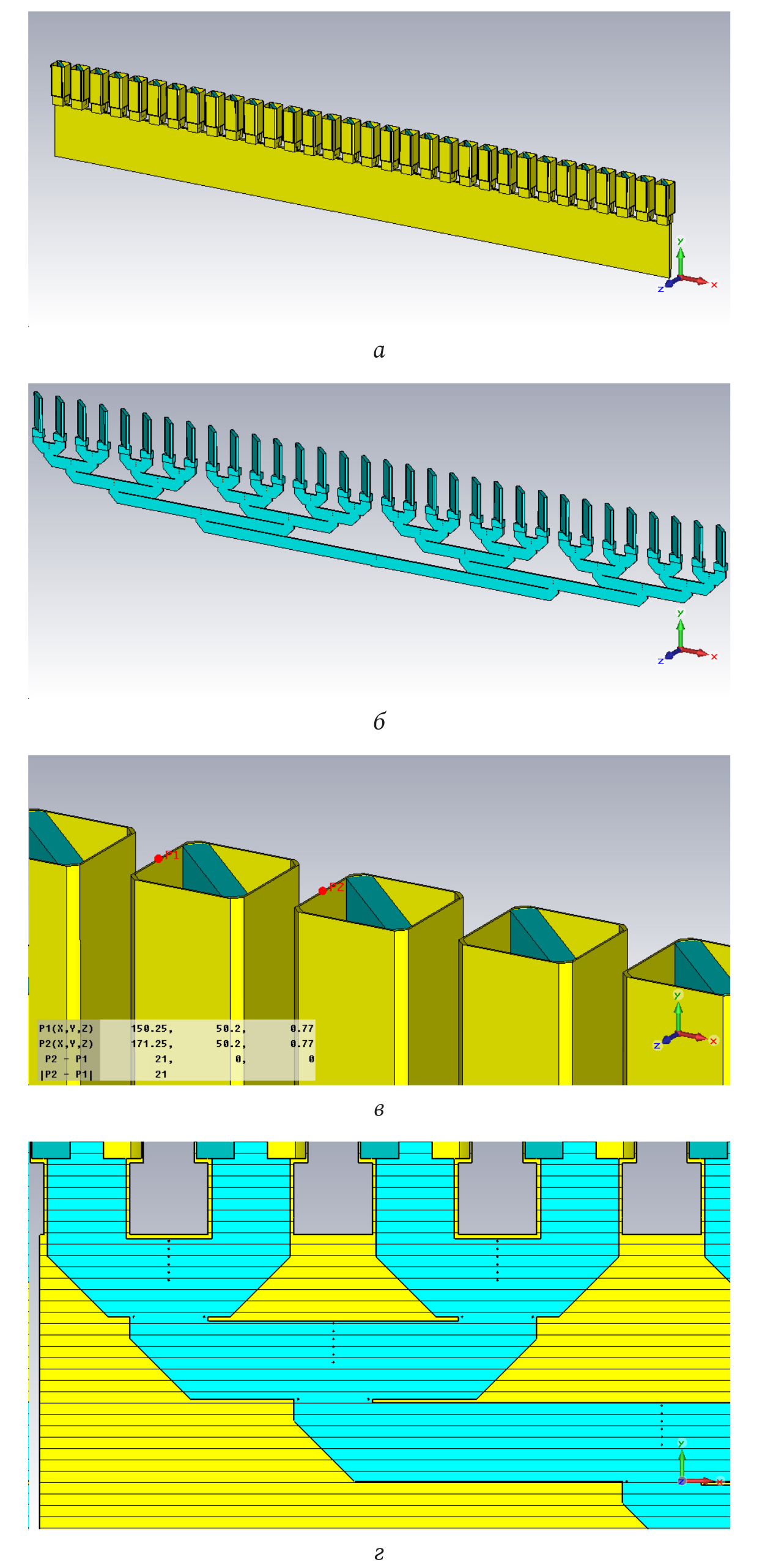 Рис. 8. Модель линейной антенной решетки из 32 элементов с синфазным и равноамплитудным делителем мощности: а – внешний вид линейной синфазной антенной решетки из 32 элементов; б – полистироловый вкладыш в делителе мощности и в антенных элементах. Толщина диэлектрика в делителе – 1,5 мм. Толщина фазирующих пластин в квадратных волноводах – 3 мм; в – период расположения элементов в линейной антенной решетке – 21 мм; г – продольный разрез линейной антенной решетки с делителем мощности (фрагмент)