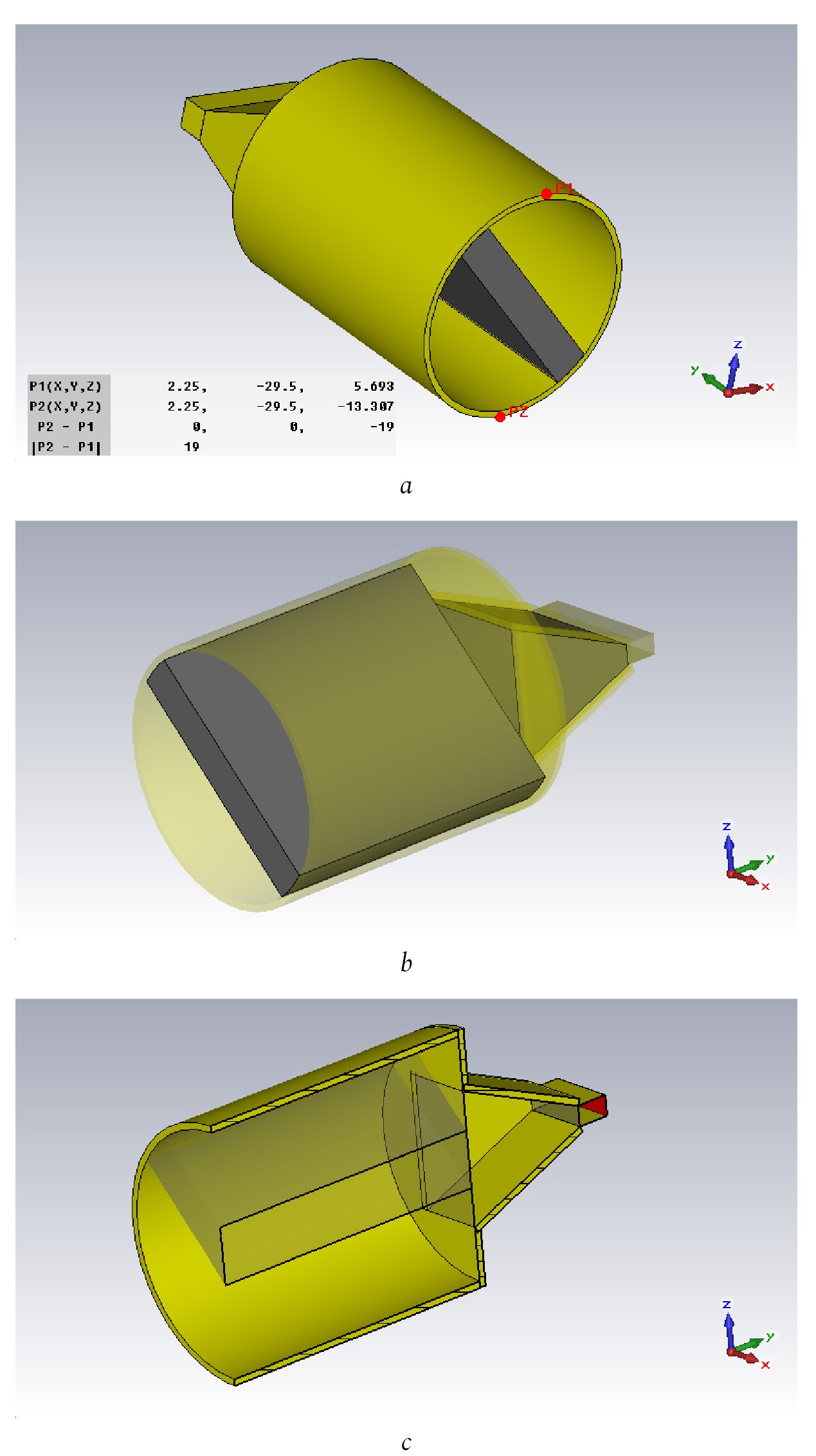 Fig. 1 shows a model of an antenna element based on a circular waveguide with an inner diameter of 18 mm and a dielectric plate whose plane is oriented at an angle of 45° to the force lines of the electric field strength vector. The circular waveguide is powered with a linear-expanding transition from the rectangular waveguide to the square waveguide, completely filled with polystyrene as dielectric, to realize the necessary spatial orientation of the plate in the circular part of the waveguide, as well as to reduce reflections from the junction of the square and circular waveguide.