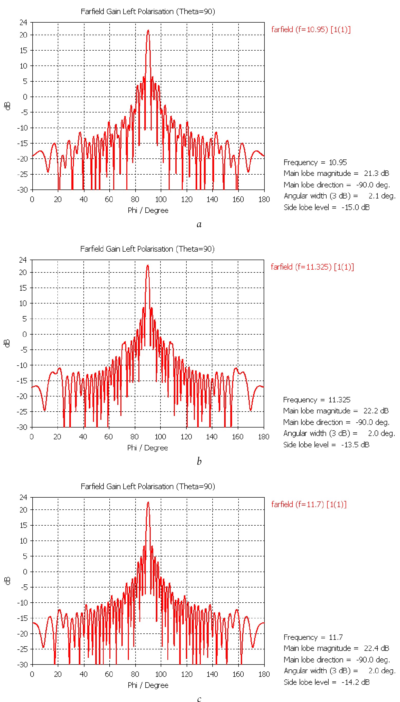 The gain at 10,95 GHz is 32,5 dB (normal) and 31,2 dB when the beam is deflected ±37,5° in the angular-local plane (excluding losses in the Rotman lens and commutator).