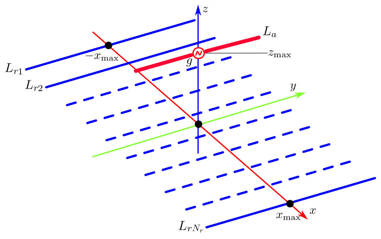 Рассматриваемая в статье структура является одним из вариантов панельной антенны, представляющей собой активный вибратор расположенный на высоте над решеткой однотипных пассивных вибраторов (рефлекторов) Геометрия структуры приведена на рис. 1. Все вибраторы являются тонкими и идеально проводящими, имеют одинаковый диаметр и расположены симметрично относительно плоскости zOx. Также исследуемая структура обладает симметрией относительно плоскости yOz. Длину активного вибратора далее будем обозначать как длину рефлекторов – как Распределения токов обозначим в соответствии с обозначениями самих вибраторов как Размер рефлектора вдоль оси равен таким образом, общий размер рефлектора равен