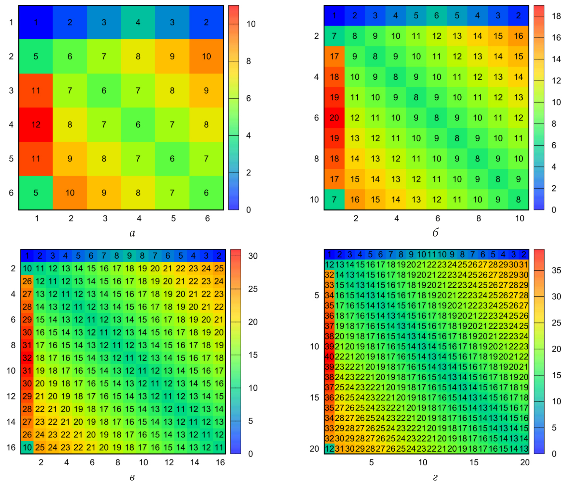 Рис. 2. Структура блочных матриц в случае 5 (а), 9 (б), 15 (в) и 19 (г) элементов рефлектора; в центре блока обозначен номер вектора существенных элементов, оси абсцисс – индексы столбцов матриц, оси ординат – индексы строк матриц; на цветовой шкале отложены номер вектора существенных элементов