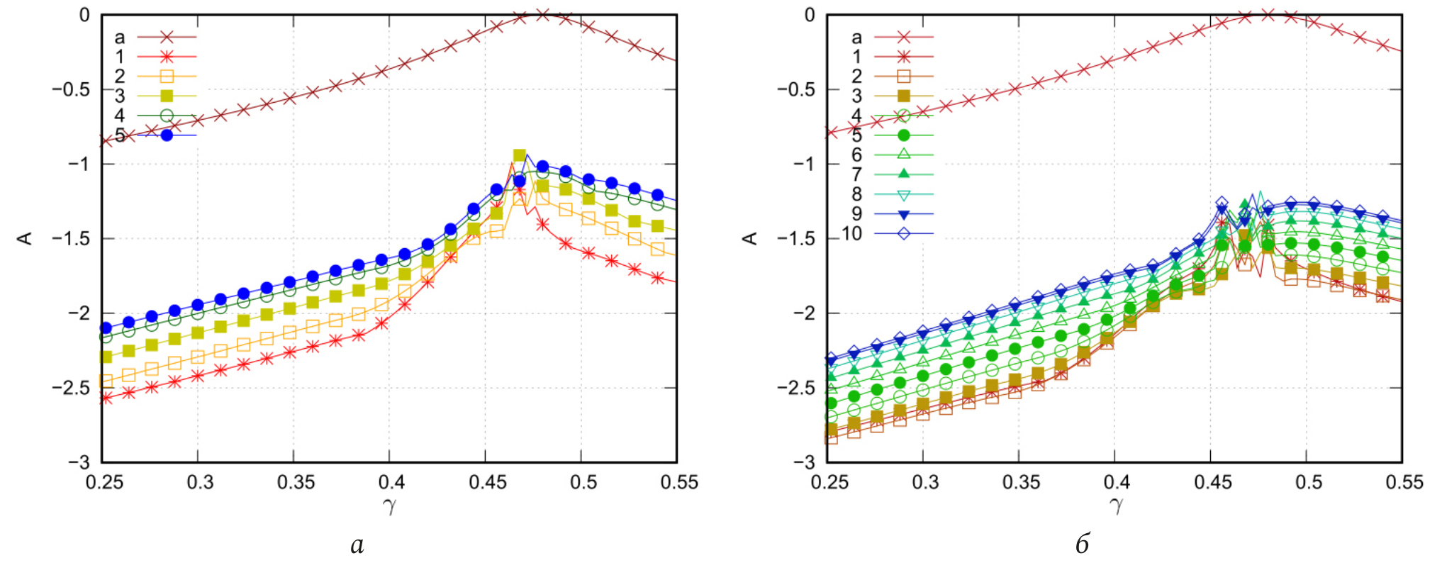 Рис. 5. Зависимость нормированных максимальных амплитуд токов на активном вибраторе (кривая «a») и элементах рефлектора (кривые 1–5, 1–10) от для рефлектора, содержащего 9 (а) и 19 (б) элементов