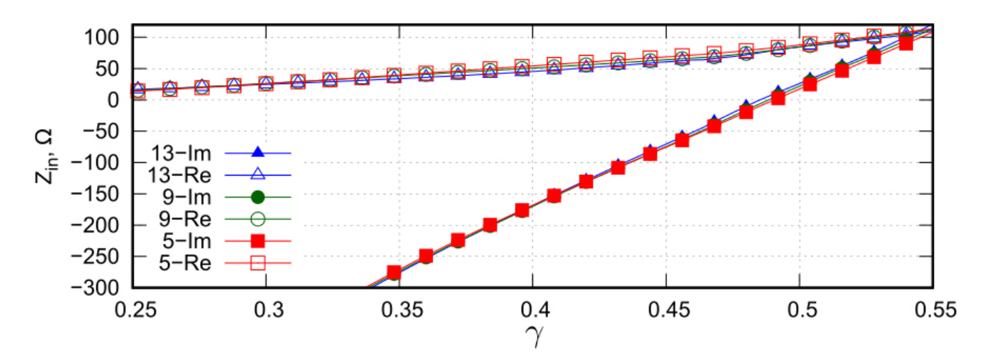 При проведении численного моделирования в качестве главного параметра, нормируемого к длине волны, была выбрана длина активного вибратора отношение в дальнейшем будем обозначать как Геометрия исследуемой структуры определялась следующими нормированными соотношениями: Половинное число сегментов на активном вибраторе и элементах рефлектора предполагалось равным соответственно. Число проекционных функций для второго варианта СПФ было равно 12 на активном вибраторе и 5 на элементах рефлектора. Амплитуда генератора ЭДС полагалась равной 1 В. Моделирование проводилось в диапазоне Отметим, что нормированная ширина зазора оказалась равной При исследовании сходимости итерационных процессов в (9) предполагалось, что Исследования проводились для различного числа элементов рефлектора – от 5 до 19, которые предполагались нечетными. При в случае СПФ первого типа матрица имела размер элементов, в случае СПФ второго типа – элементов. Очевидно, что в последнем случае решение СЛАУ прямыми методами не представляет особых проблем с точки зрения затрат машинной памяти и машинного времени.