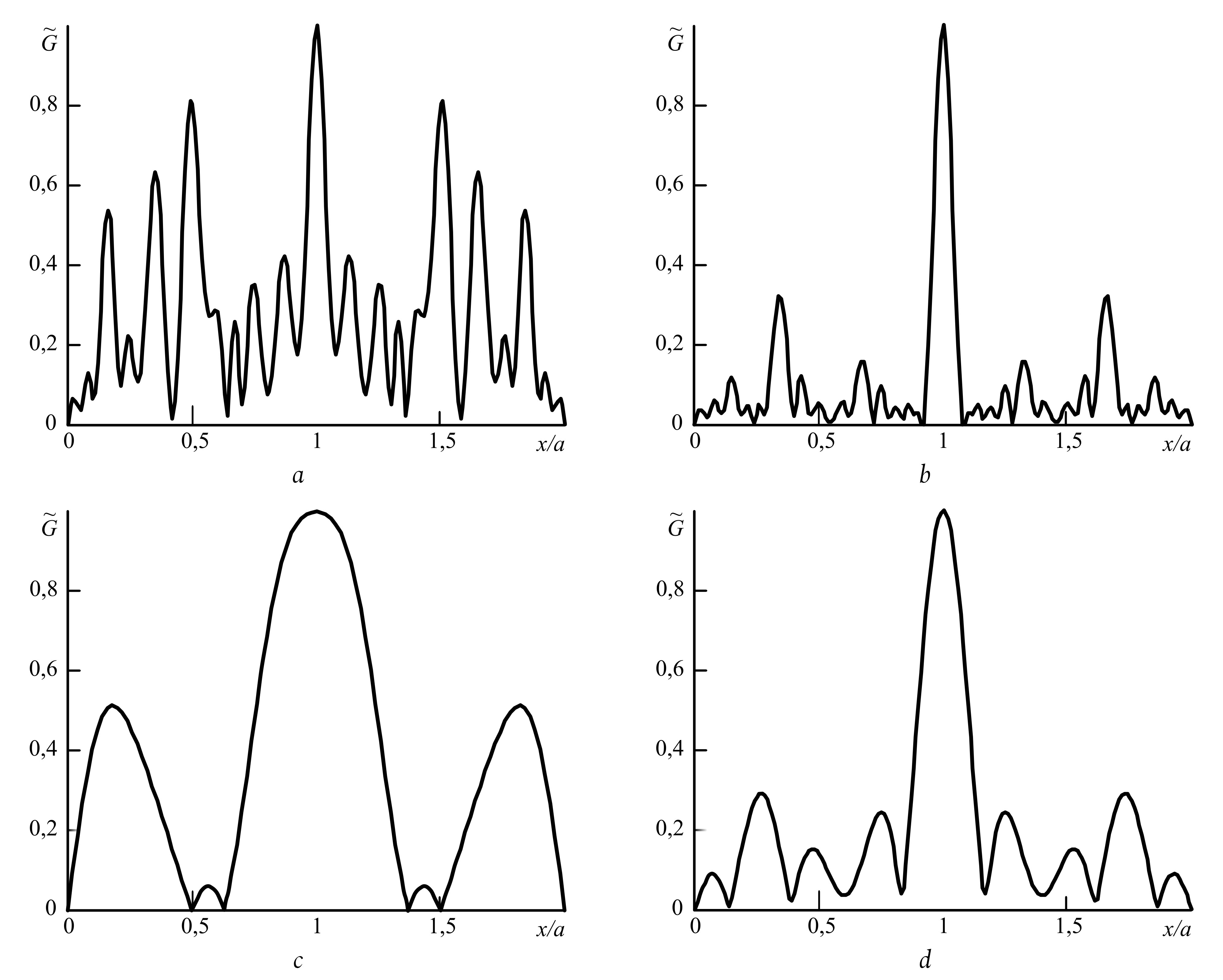 Fig. 1. Dependence of the PSF modulus on the transverse coordinate at (a, b), 0,5 (c, d): the first pump wave is single-mode with the mode number the amplitude of the second pump wave changes according to the Gaussian law, (a, c), 8 (b, d)