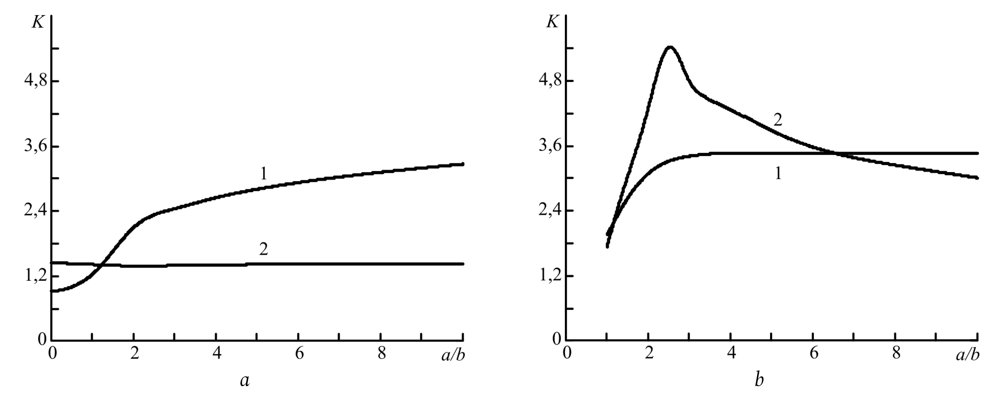 Fig. 3. Dependence of the contrast of the PSF module on the width of the Gaussian pump wave: the second pump wave is Gaussian, the first pump wave is single-mode (1); the first pump wave is Gaussian, the second pump wave is single-mode (2) at (a), 0,5 (b)