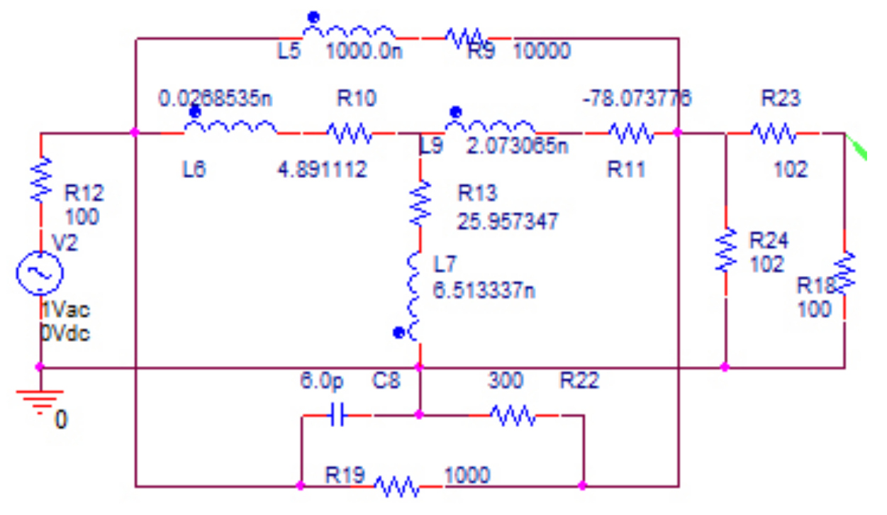 Схема НЧ реализована в виде параллельно соединенных эквивалентной схемы нелинейного элемента и цепи обратной связи из П-образного соединения трех элементов – Параметры ЦОС заданы произвольно. Схема РЧ собрана на основе Г-образного соединения двух элементов –