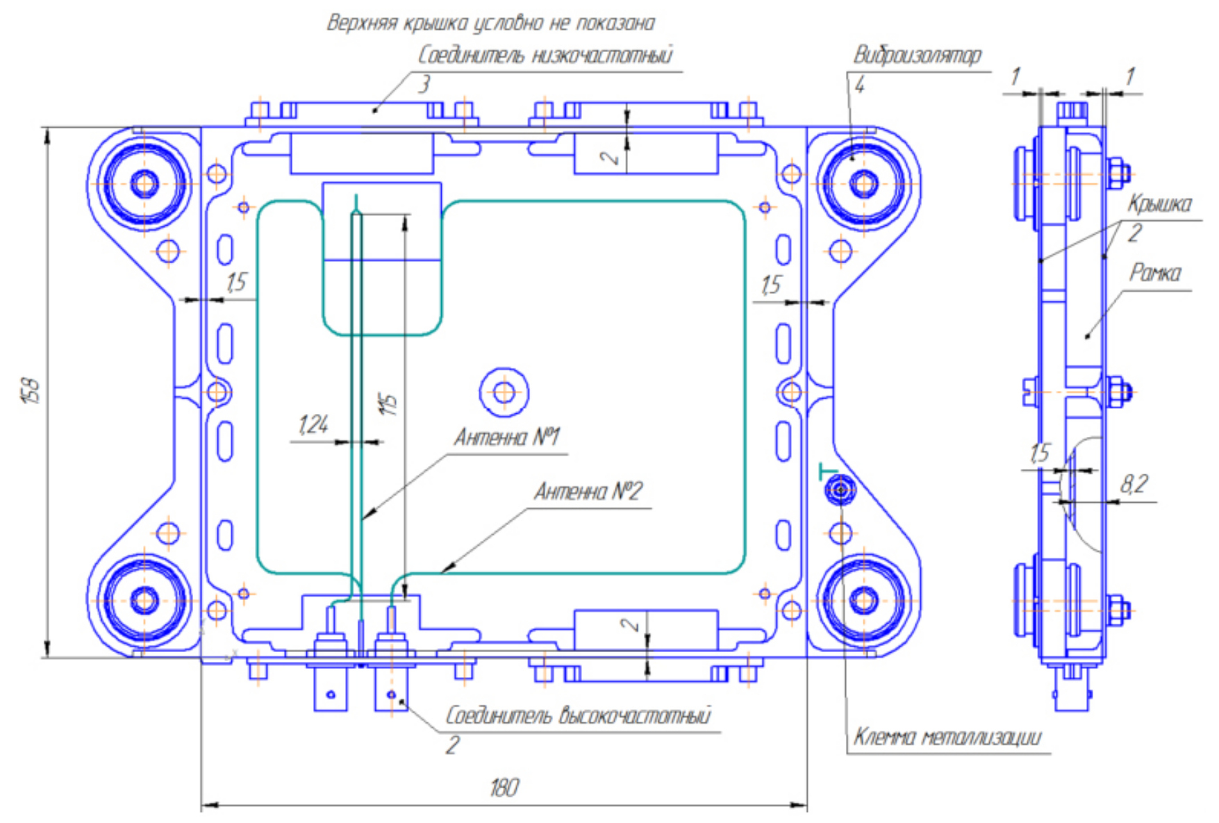 Рис. 1. Макет прибора с указанием расположения антенн № 1 и № 2