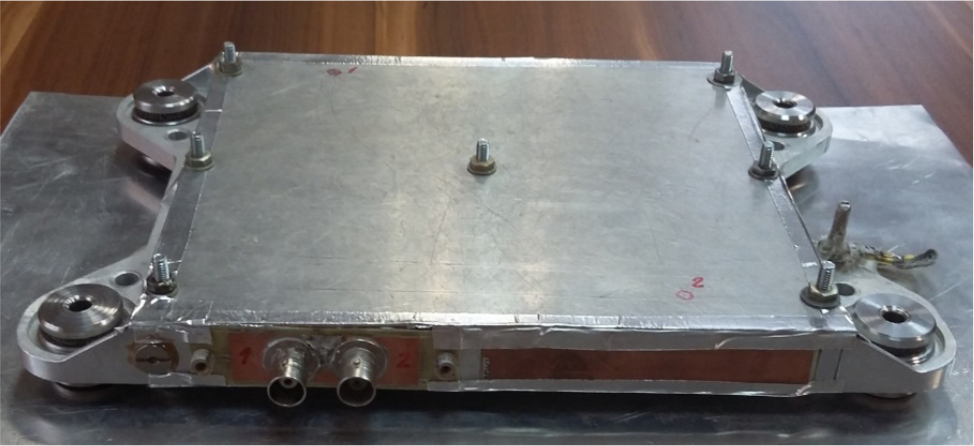 В качестве объекта испытаний (ОИ) был использован макет радиоэлектронного устройства, который ранее исследовался на воздействие электростатического разряда с помощью ГЭР в атмосфере воздуха. За основу был взят макет, описанный в [5]. Он был конструктивно доработан с учетом размеров, схемы подключения, оснастки и электрофизических характеристик вакуумной камеры. Доработанный макет представляет собой модуль первого уровня с расположенными внутри корпуса антеннами № 1 и № 2 (рис. 1). На рис. 2 приведена фотография макета.