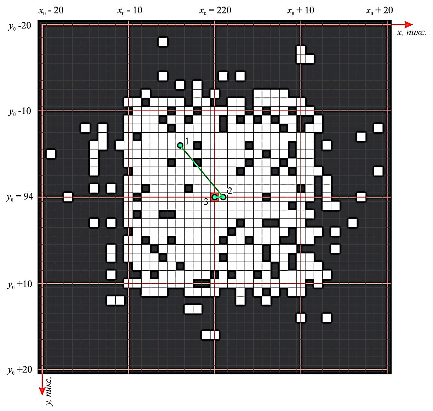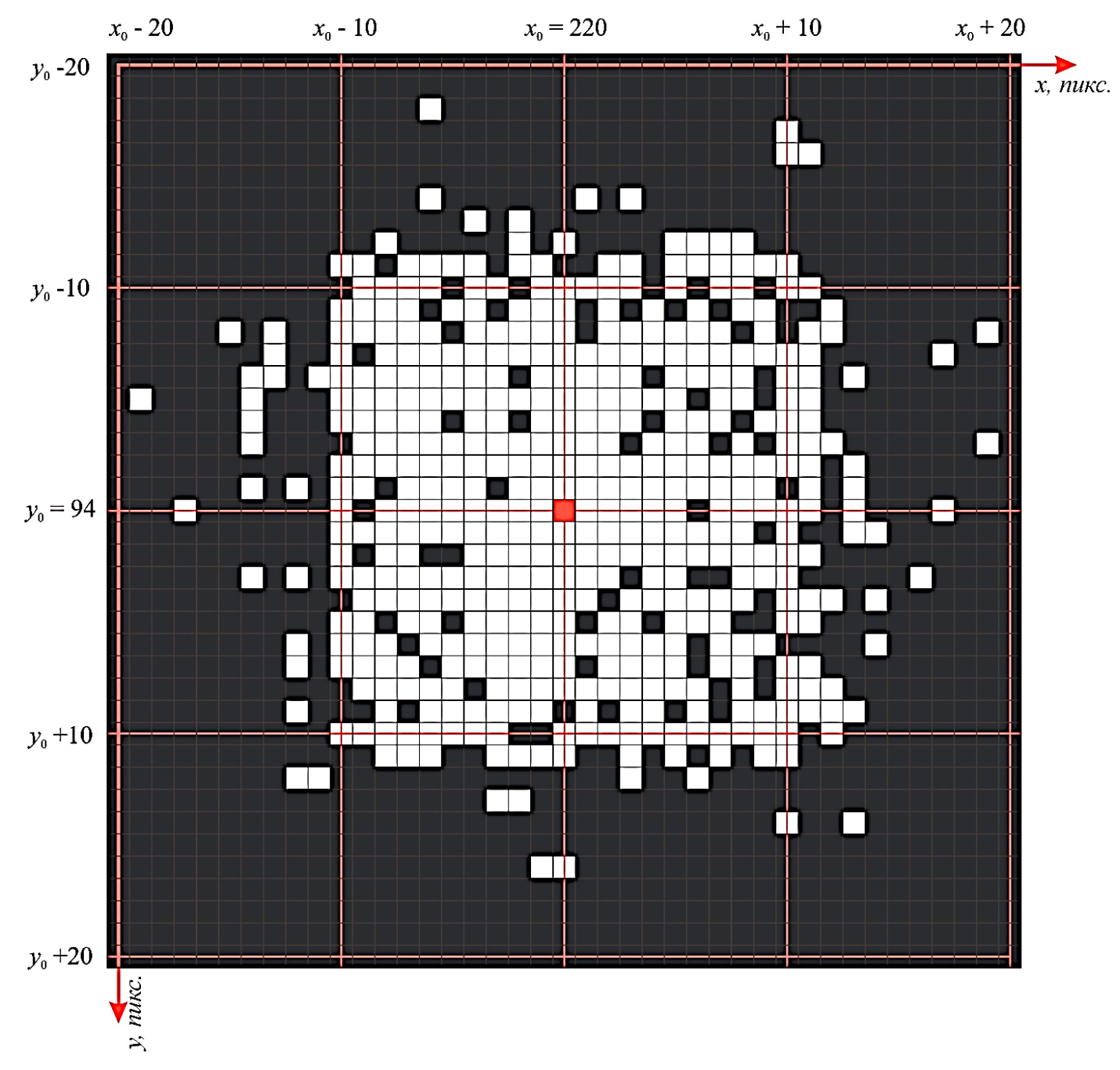 Второй эксперимент был проведен с целью определения точек в окрестности (220, 94), которые позволяют корректно совместить телевизионные сигналы в результате обработки по итерационному методу. В эксперименте проверялась окрестность размером ±20 пикселей (см. рис. 4). Белым цветом были отмечены точки, обеспечивающие корректные совмещения.