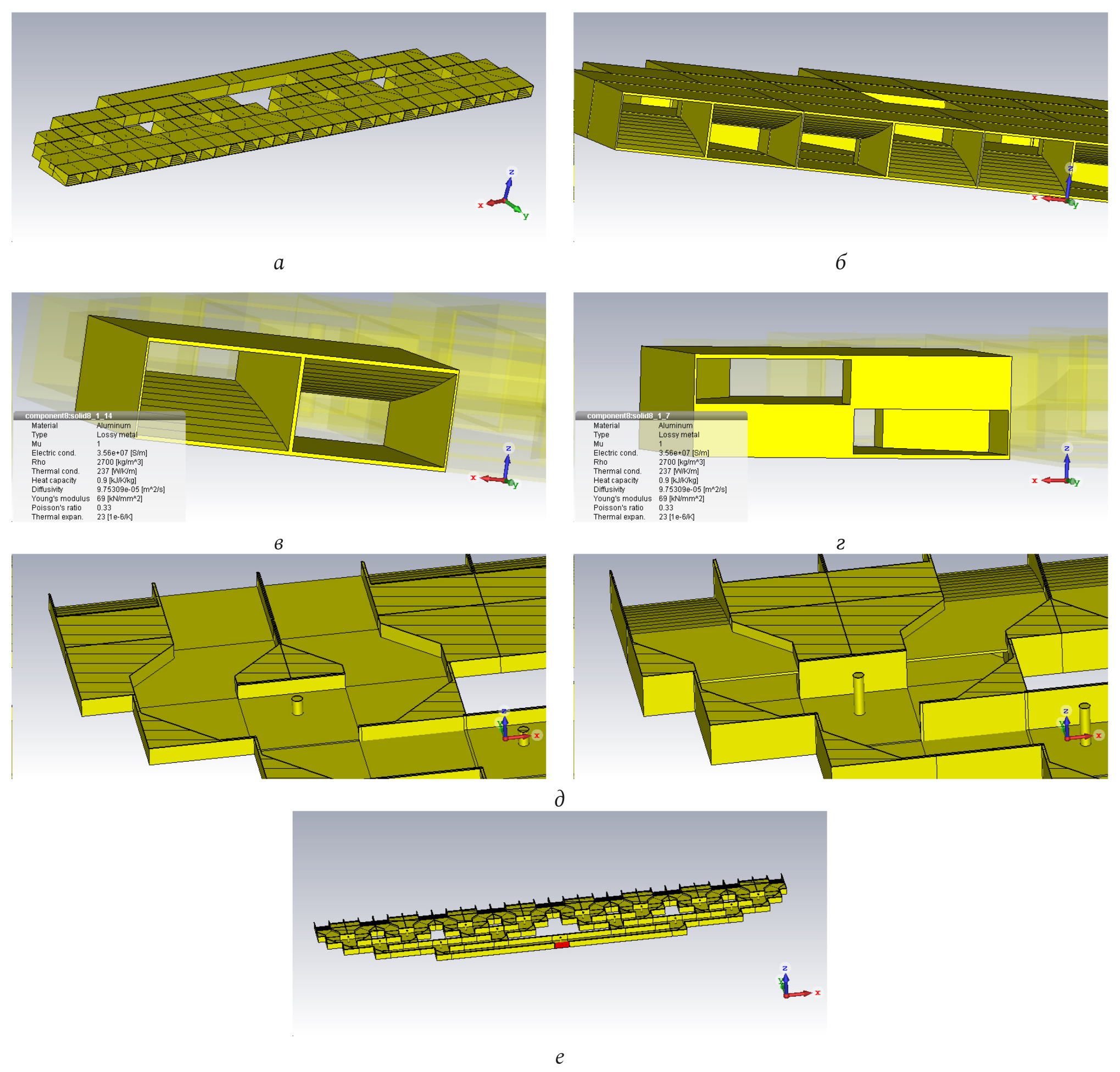 Рис. 1. Линейная эквидистантная антенная решетка с делителем мощности 1:32, в котором использованы Е-плоскостные (для запитки излучателей) и Н-плоскостные делители мощности 1:2: а – внешний вид линейной решетки; б – фрагмент излуча ющей апертуры; в – пара соседних излучателей с противоположными направлениями раскрывов несимметричных волноводных Е-плоскостных рупоров; г – волноводы, питающие соседние излучатели; д – продольные разрезы решетки на различных значениях высоты; е – разрез решетки и волноводный порт ее запитки