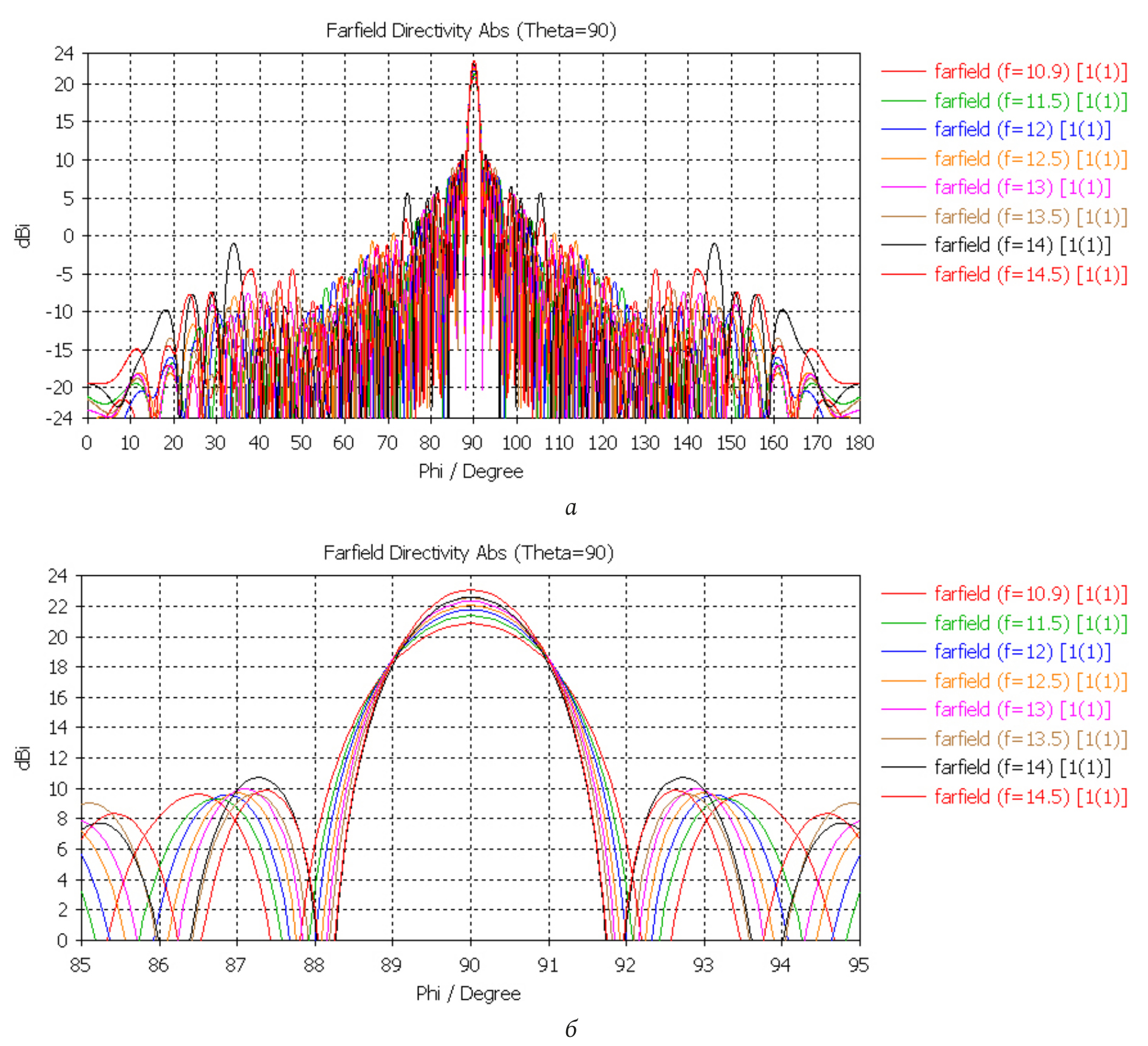 Рис. 3. Диаграммы направленности линейной эквидистантной антенной решетки с Е- и Н-плоскостными делителями мощности в азимутальной (а) и угло-местной (б) плоскостях