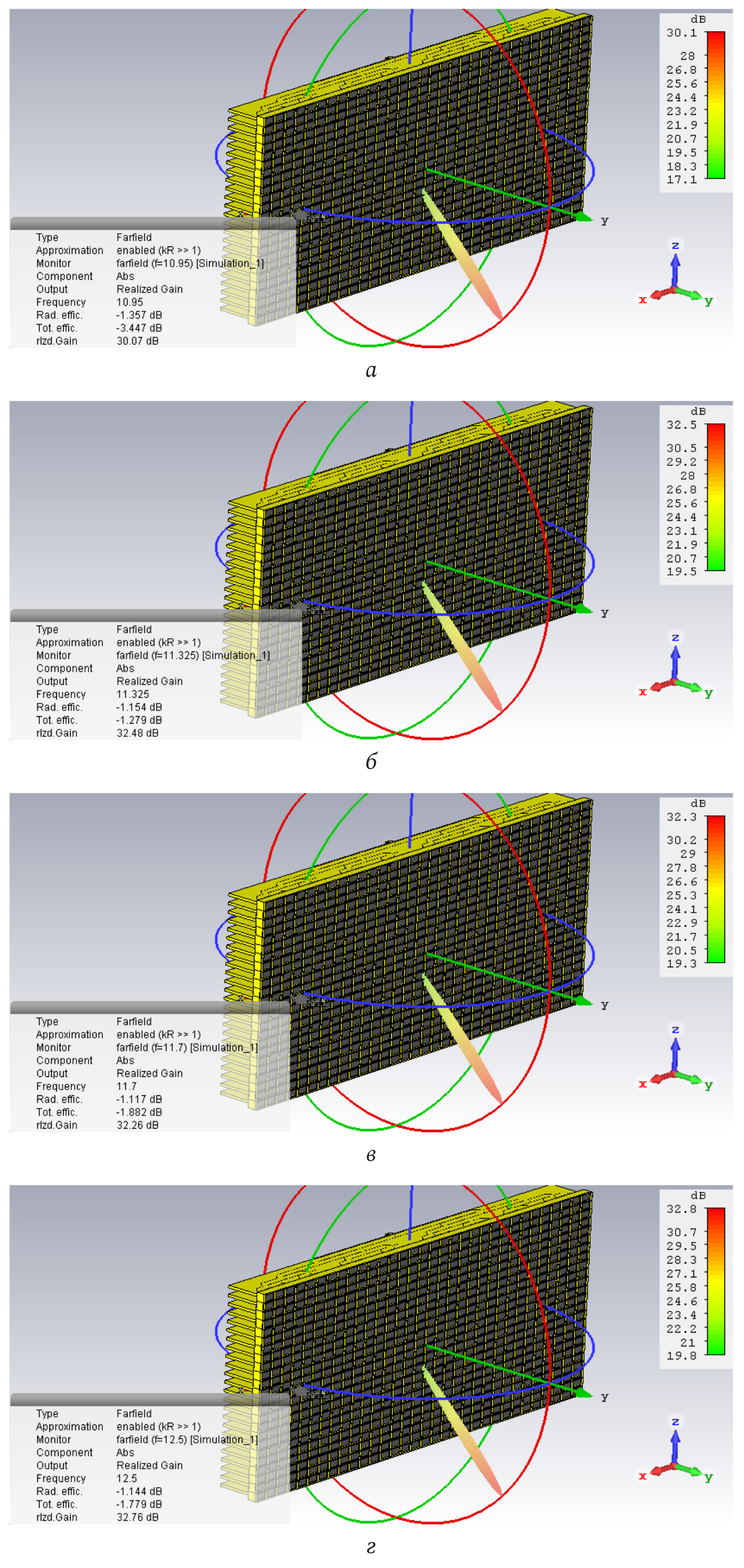 Рис. 12. Диаграмма направленности ФАР при отклонении луча на угол 45° от нормали на частотах: а – ГГц; б – ГГц; в – ГГц; г – ГГц