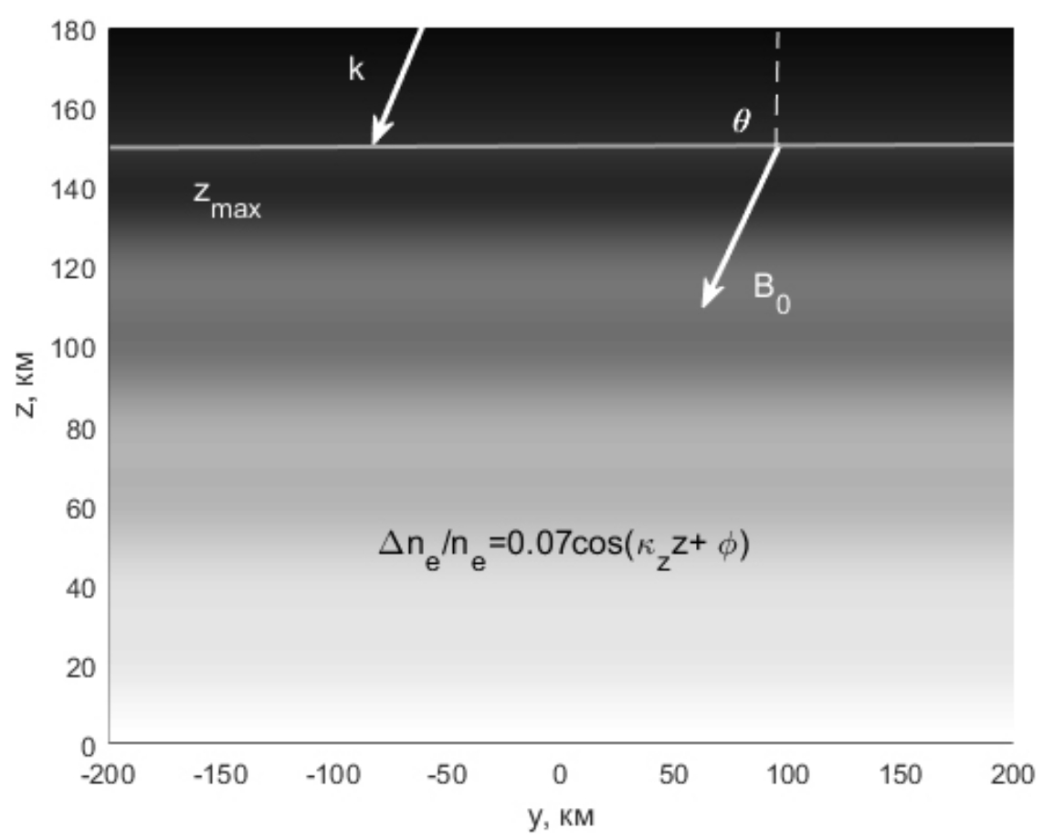 Предположим, что на ионосферу падает сверху свистовая электромагнитная волна с частотой Пусть ось направлена вертикально вверх, значения и соответствуют поверхности Земли и поверхности падения свистовой волны, магнитное поле Земли лежит в плоскости y, z и составляется с осью угол Ионосферную плазму выше границы будем считать однородной. Рассмотрим задачу о влиянии малых возмущений плазменной концентрации в инфразвуковой волне на процессы распространения свистовой волны. Для плазменной концентрации используем модельную зависимость