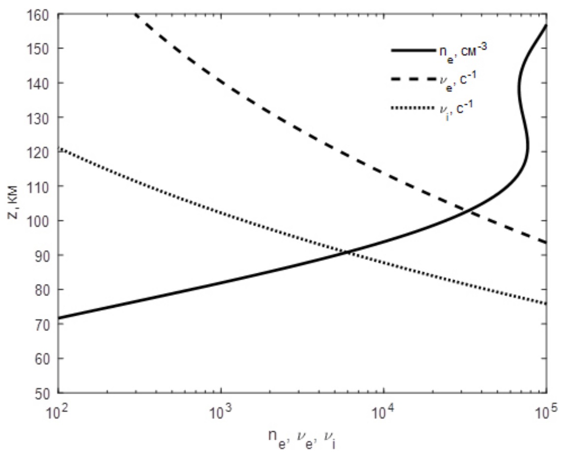 Рис. 2. Высотные профили плазменной концентрации (сплошная линия) частоты столкновений электронов (пунктирная линия) и ионов (кор. пунктирная линия) с нейтральными частицами