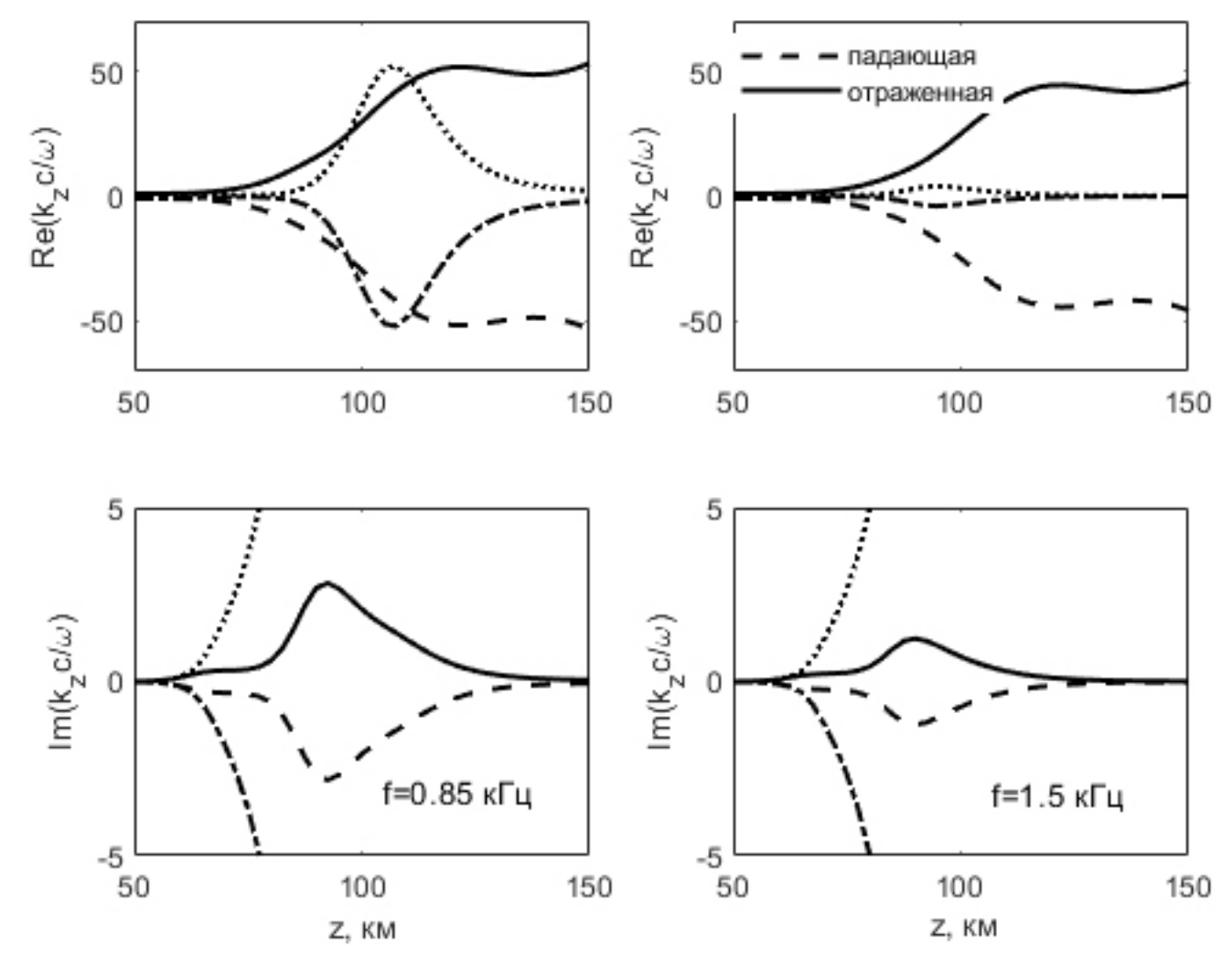 Примеры результатов расчетов для свистовых волн с частотами 0,85 кГц и 1,5 кГц приведены на рис. 3–5. На рис. 3 представлено решение дисперсионного соотношения (7) для невозмущенной ионосферной плазмы при Из приведенных графиков видно, что мнимая часть вертикального показателя преломления распространяющихся волновых мод увеличивается в несколько раз в относительно локальной по высоте области 80–110 км. Следовательно, характеристики распространения и отражения свистовых волн могут быть особенно чувствительны к возмущениям плазменной плотности именно на этих высотах. Поскольку значения показателя преломления на этих высотах много больше единицы, приведенные зависимости справедливы также для наклонно падающих волн с горизонтальными компонентами порядка единицы или нескольких единиц.